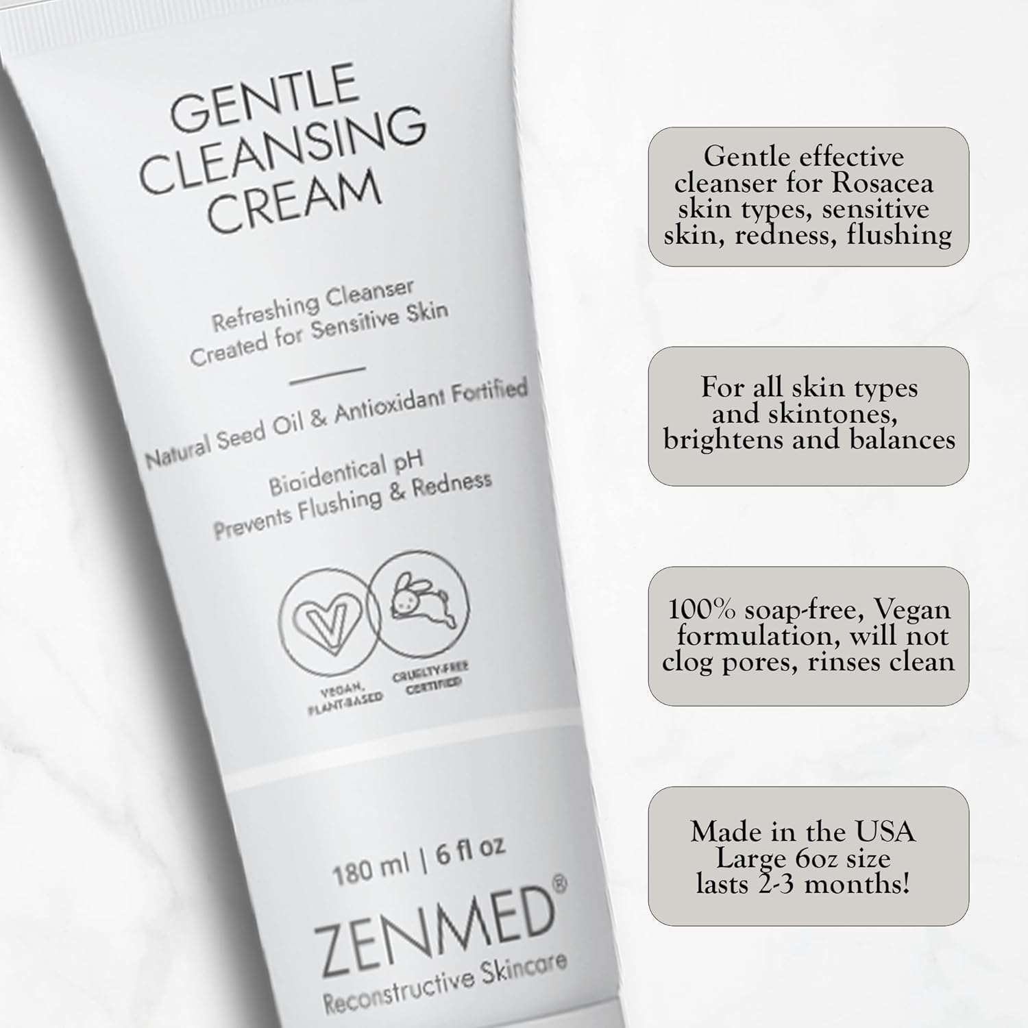 ZENMED Gentle Cleansing Cream - 6 oz. 100% Vegetarian Natural See Oil & Antioxidant Fortified Help Control Redness & Flushing pH 6.0 Soap-Free Will Not Over-Dry