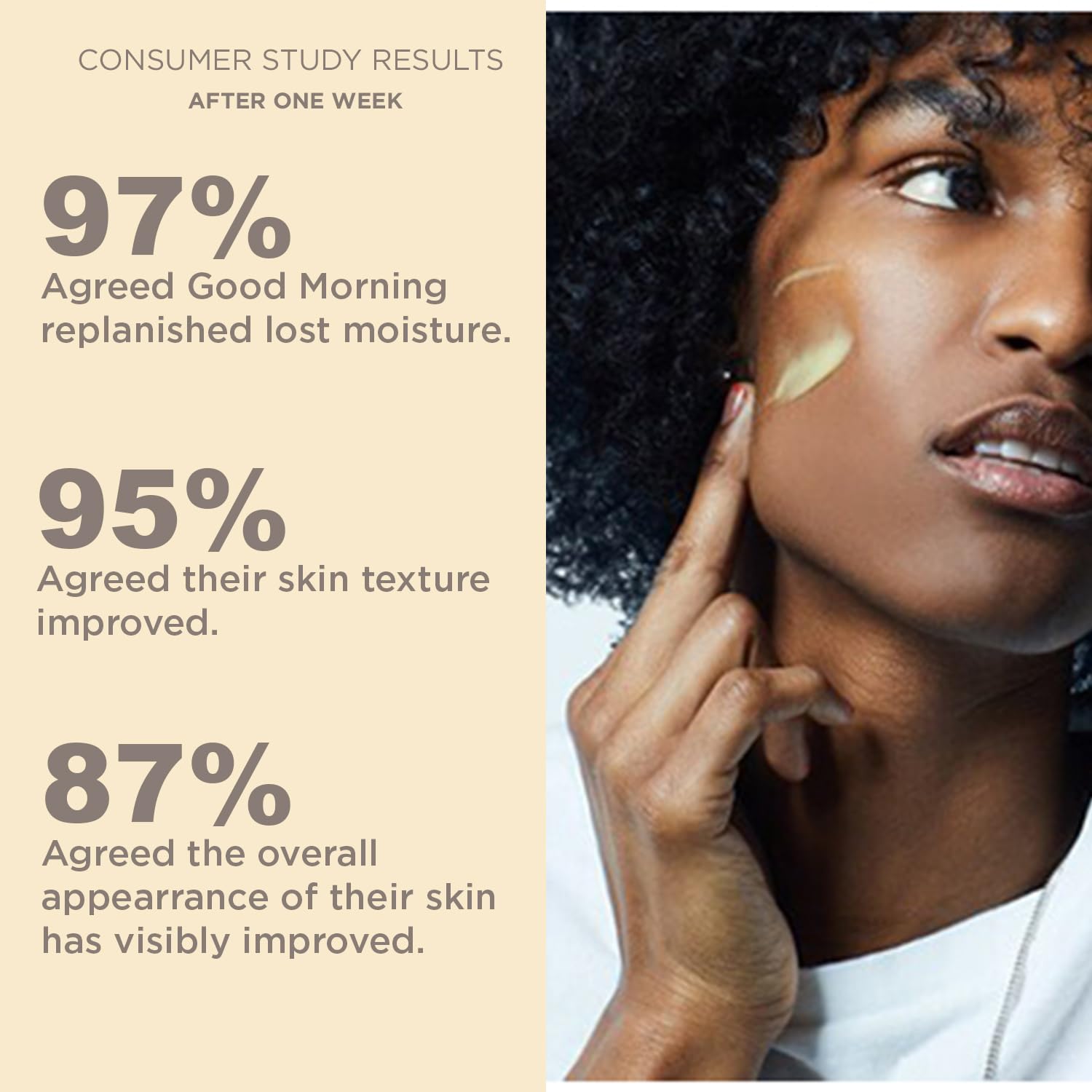 - CONSUMER STUDY RESULT: After a once-a-day usage for 7 days: 97% Agreed Good Morning replenished lost moisture. 95% Agreed their skin texture and visible fine lines improved. 87% Agreed the overall appearance of their skin has visibly improved.