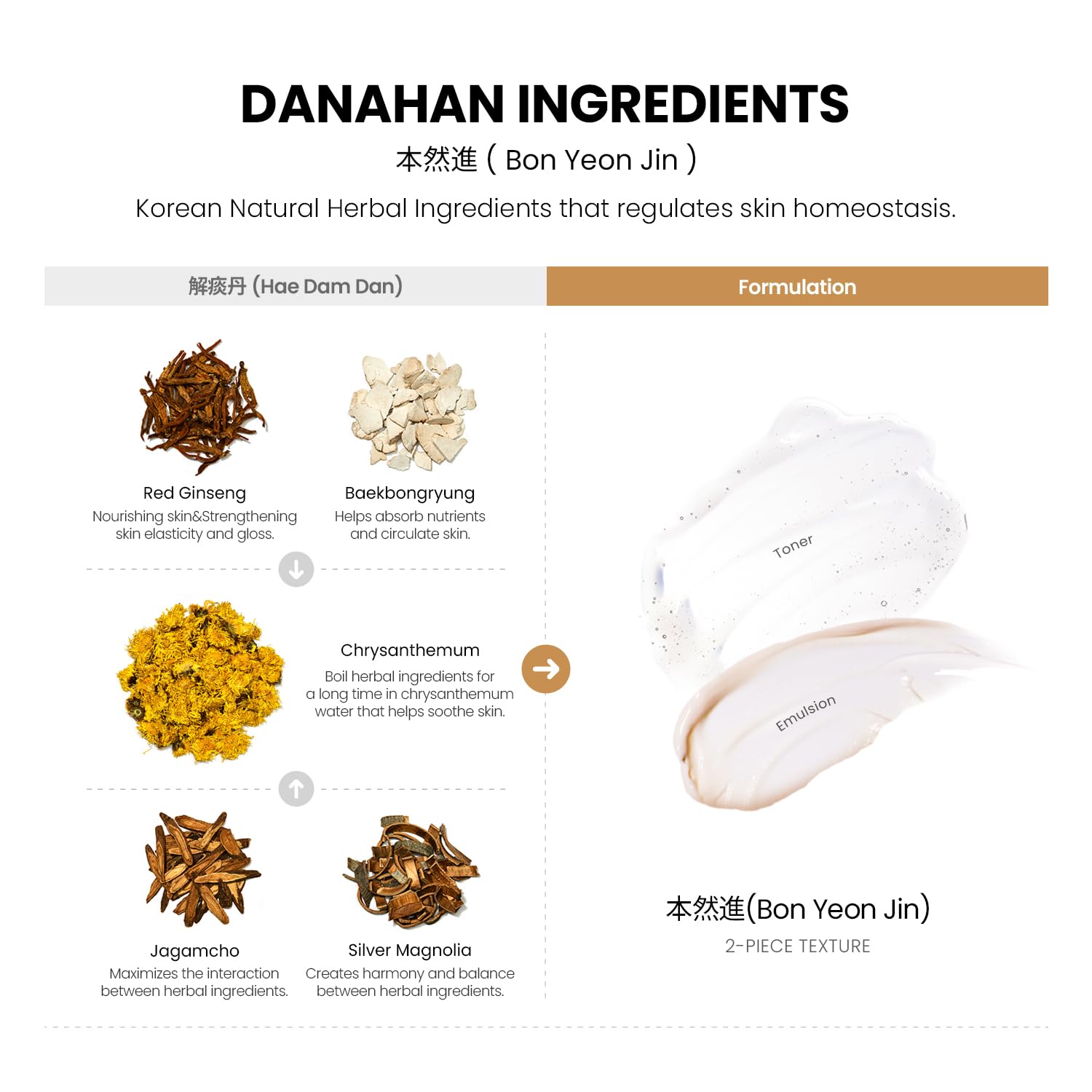 - Danahan Bon Yeon Jin is made with a powerful skin-rejuvenating formula of high-quality Red Ginseng and natural Korean natural herbal medicine to hydrate, nourish, and visibly rejuvenate skin.