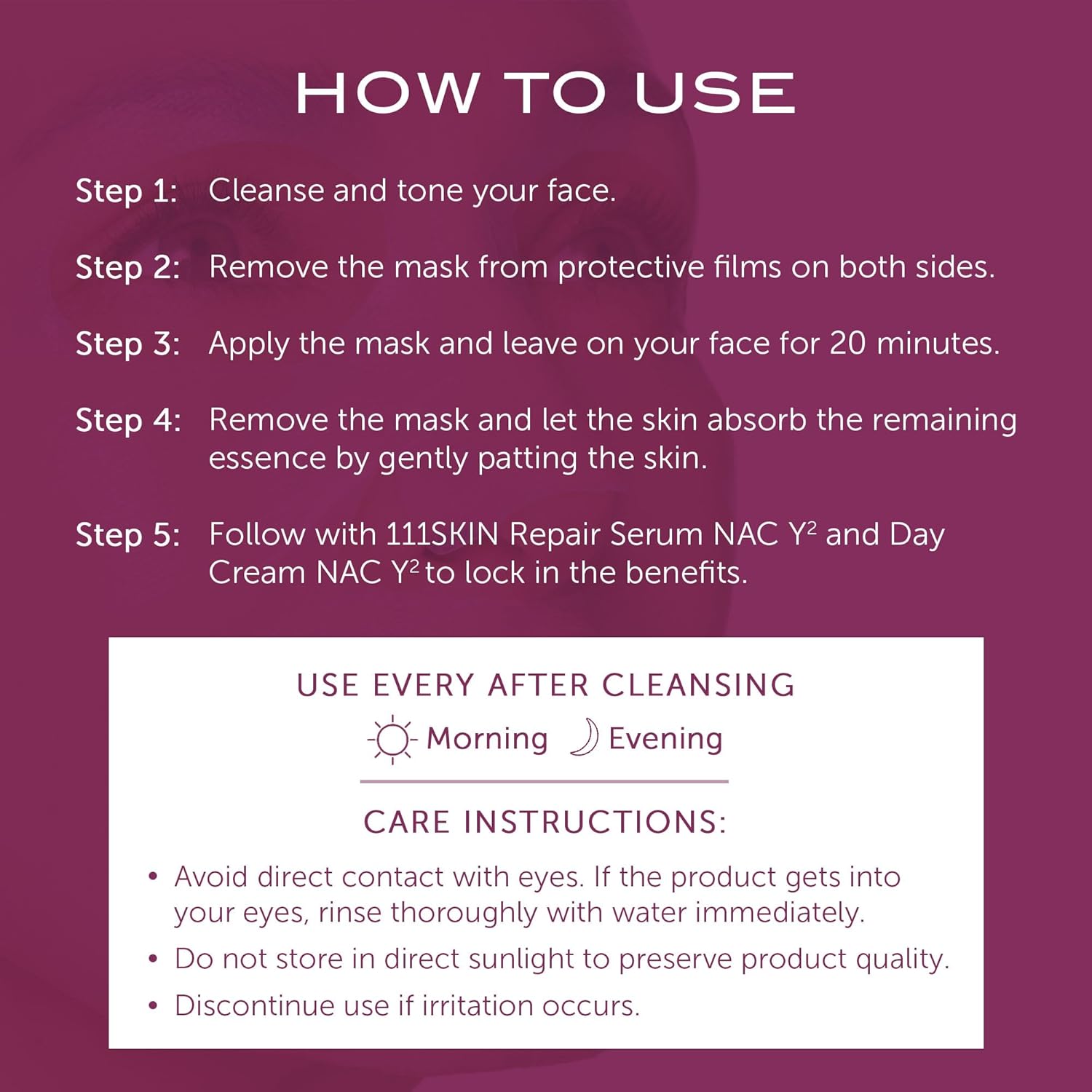 - How to Use: After cleansing and toning your skin, remove the mask from the protective film on both sides and leave on your face for 20 minutes.