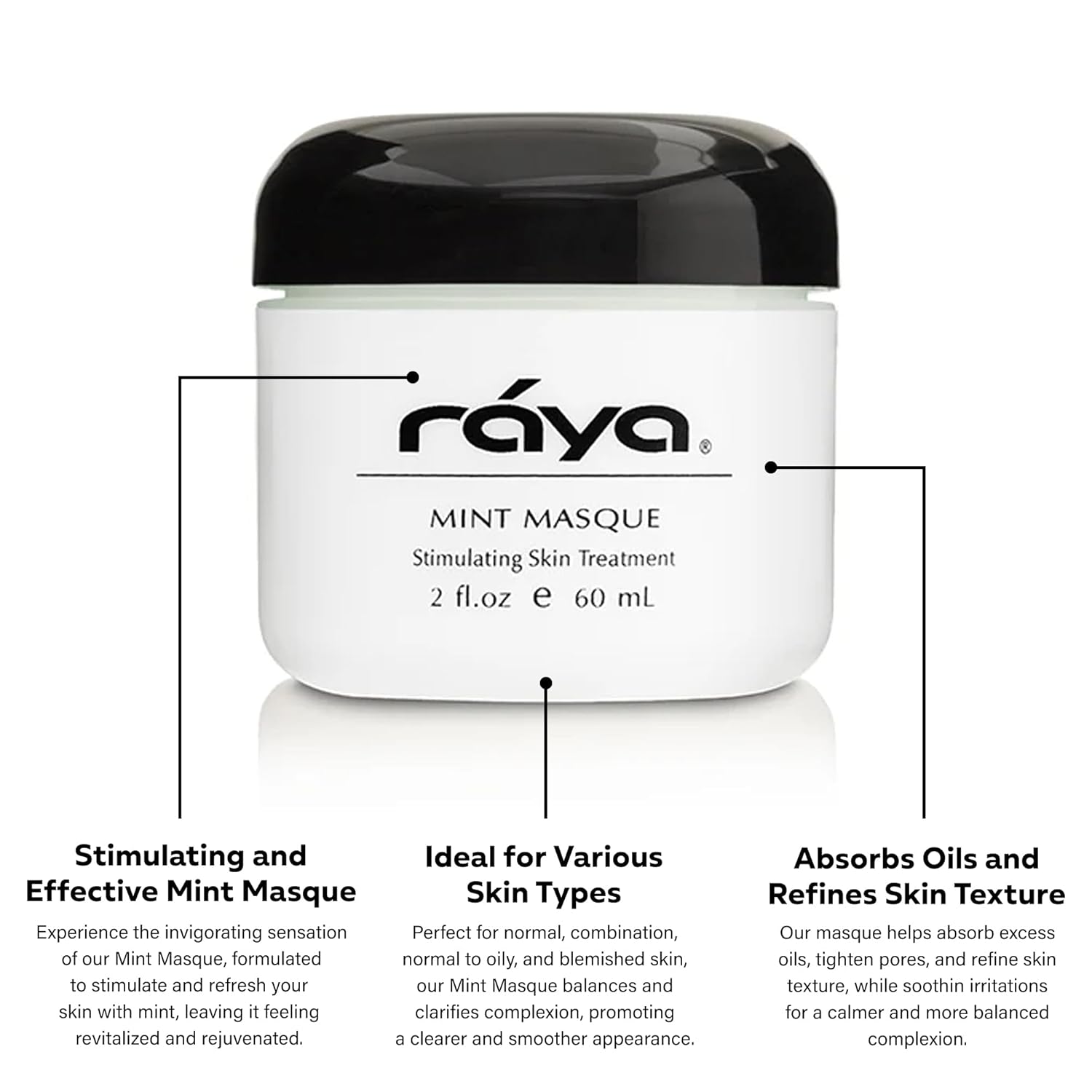 - Unique Cooling Formula: The Raya Mint Masque offers a refreshing and revitalizing treatment, ideal for normal to oily skin types. Formulated with mint and kaolin clay, this facial mask deeply cleanses pores, soothes skin, and balances oil production for a naturally radiant complexion.