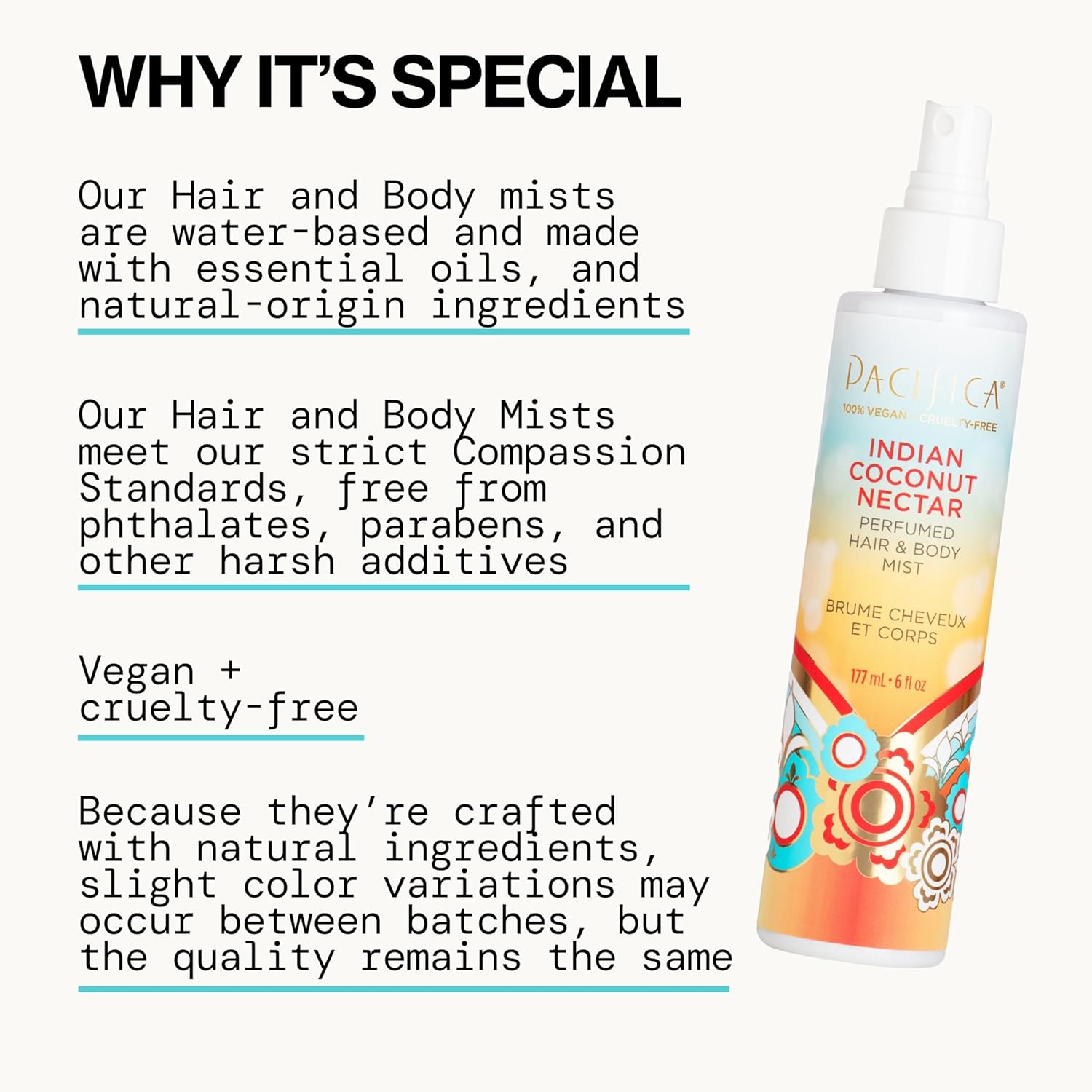 - HELPS GROUND YOUR MIND: Pacifica's Indian Coconut Nectar Hair & Body Mist blends creamy coconut, vanilla, sugar crystals, and resinous amber to help ground your mind. Our functional fragrances are key tools for your wellbeing.