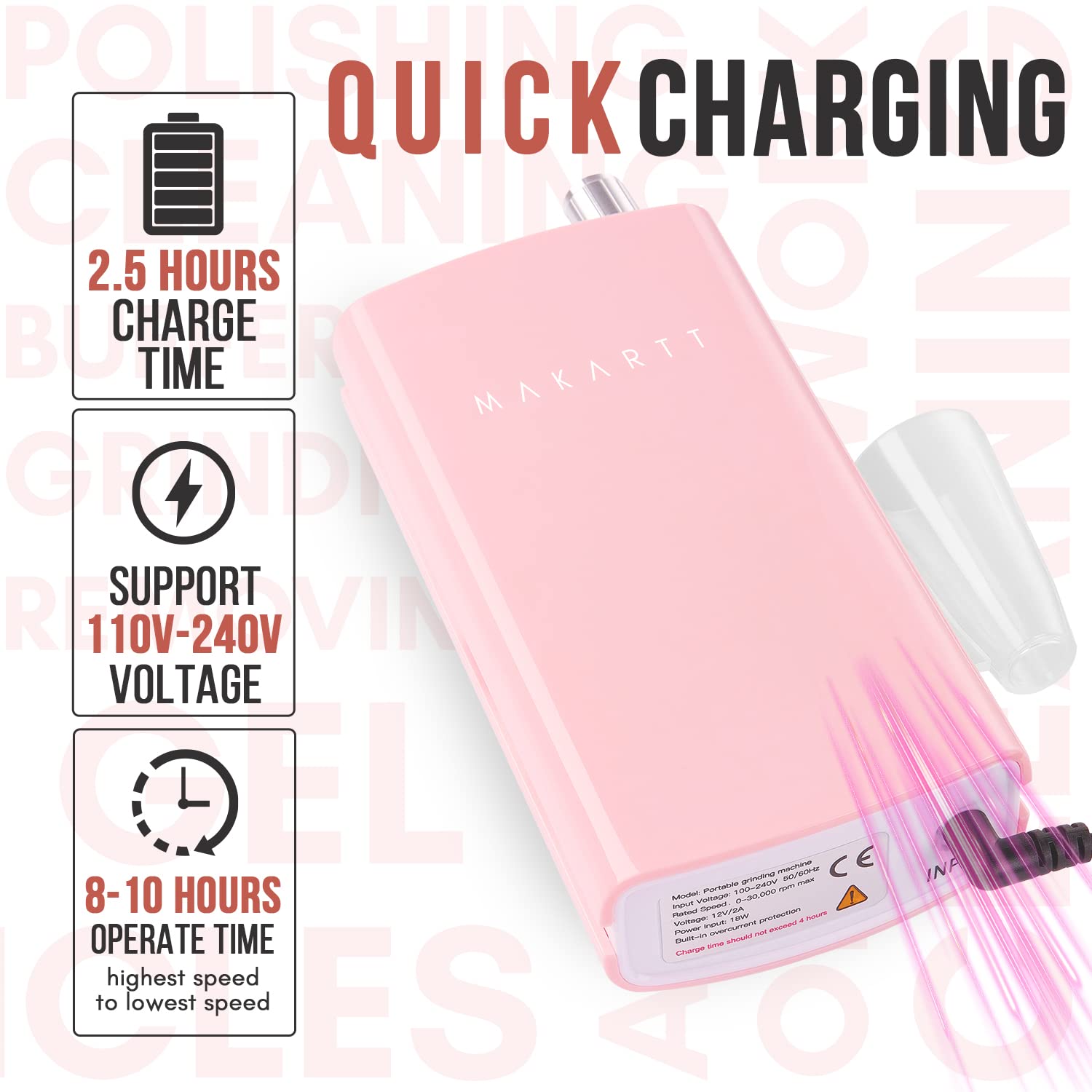 - Rechargeable, Portable & Enduring - Makartt rechargeable nail drill has a built-in 1200mAh battery capacity. It can be fully charged in 2.5 hours, and in the case of a full charge, this nail file electric can be used for 8 hours. Operates unplugged, its riveting design allows easy install/dismantle. Hangable on belt/waist, or packable for travel.