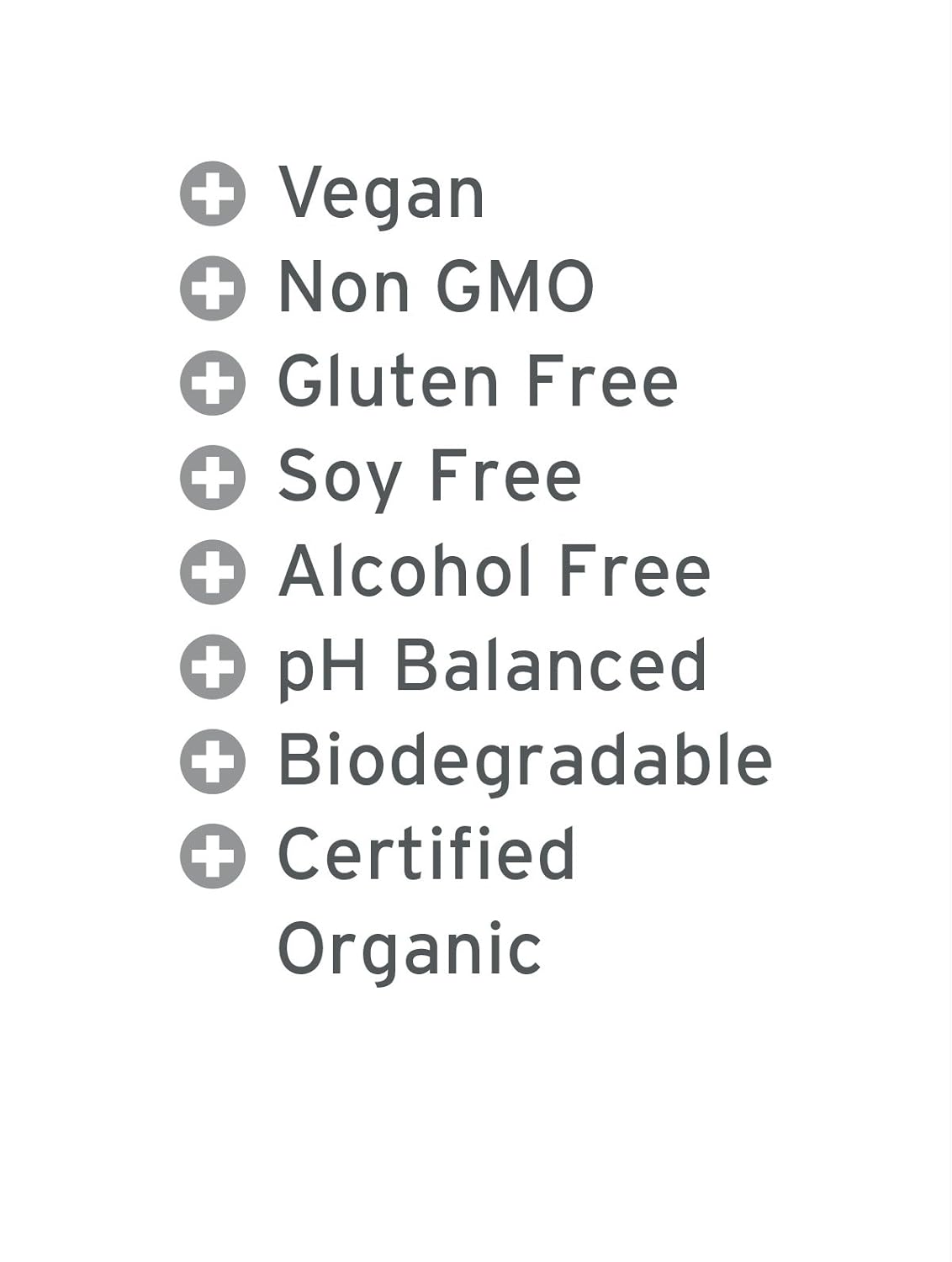 - Alcohol Free, Biodegradable, Certified Organic, Gluten Free, Paraben Free, Non GMO, pH Balanced, Soy Free, Vegan