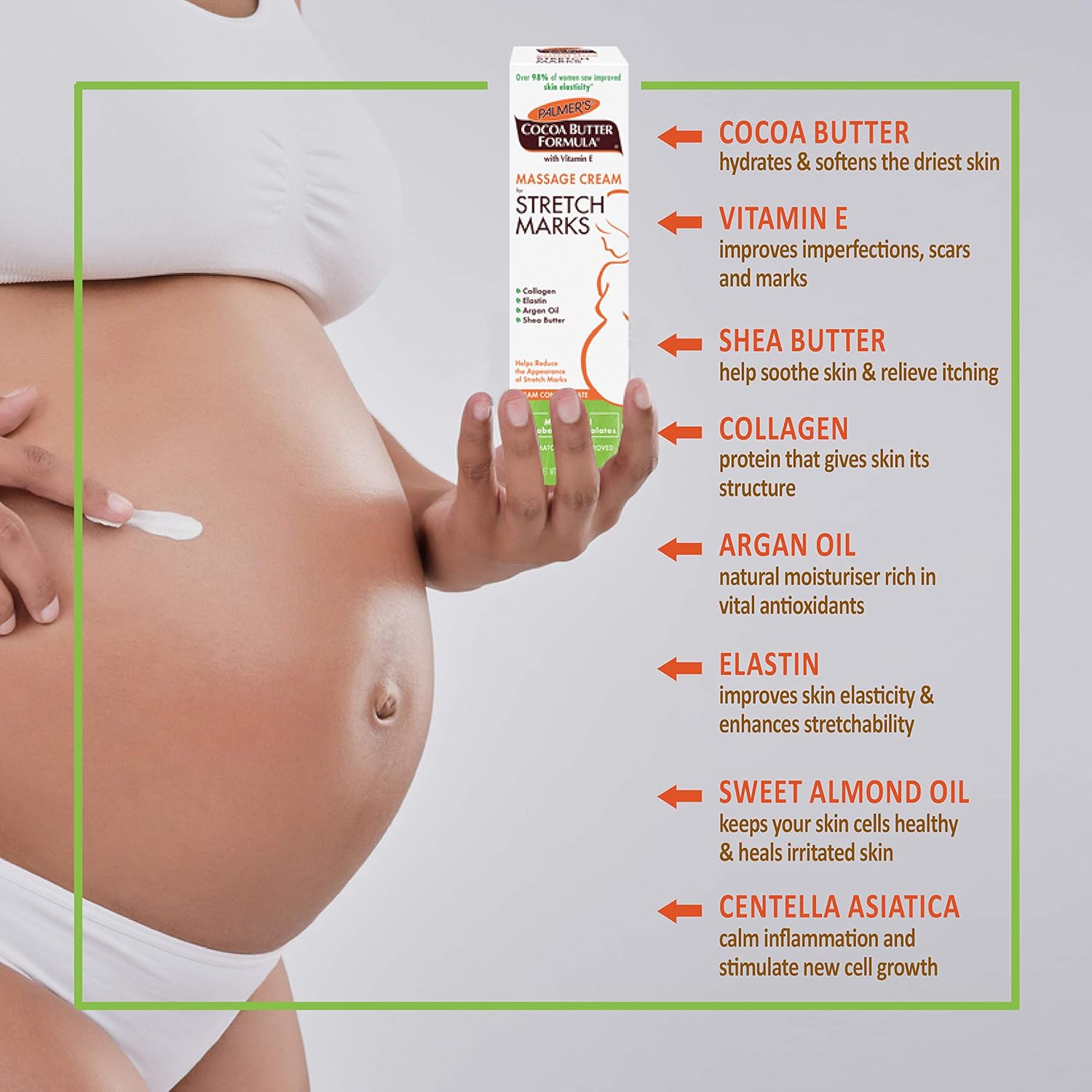 - Massage Cream For Stretch Marks: This Cocoa Butter massage cream helps visibly improve your skin elasticity and reduce the appearance of stretch marks due to pregnancy or other fluctuations in weight