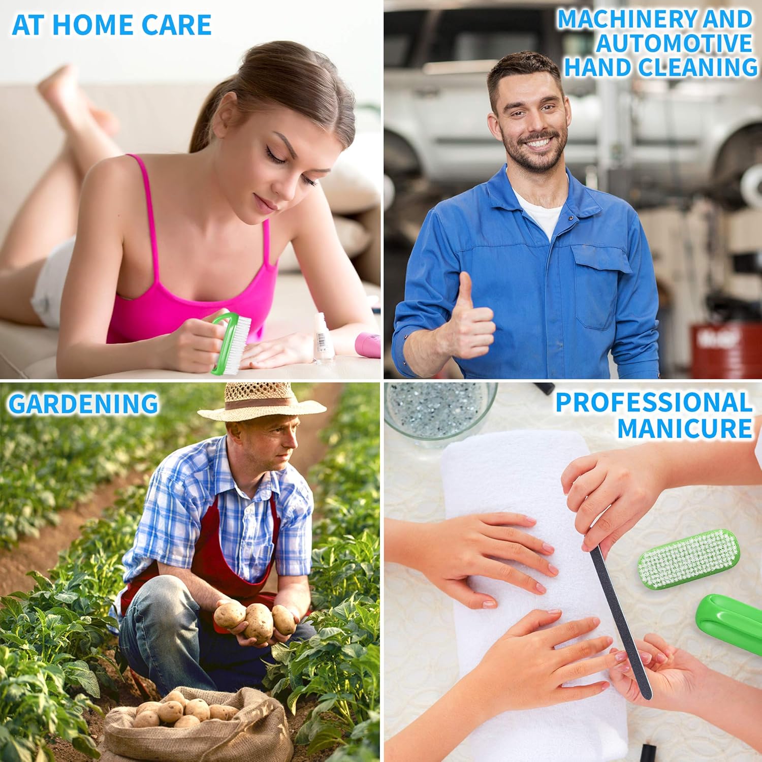 - Fingernail brushes for cleaning under nails are used in Gardening, Crafting, Mechanical, Fishing and Manicure