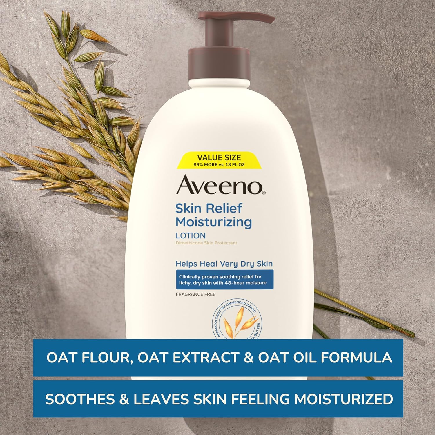 - Lotion for very dry skin: Value-size 33 fl. oz. Aveeno Skin Relief Moisturizing Lotion delivers 72-hour* moisture and soothing relief for itchy, very dry skin; with triple oat, shea butter, and dimethicone; fragrance-free, non-greasy formula