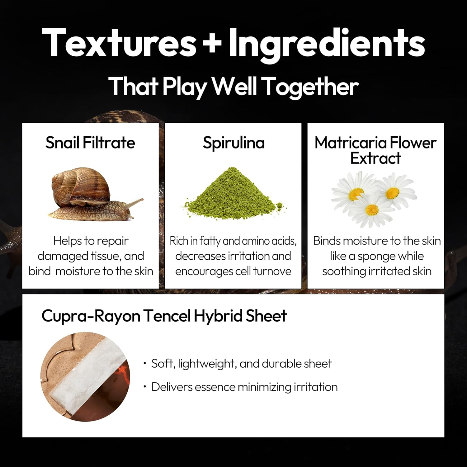 - REGENERATING SNAIL SKINCARE - Our Escargot cupra rayon and tencel sheet mask, rich in revitalizing benefits, helps to reverse environmental damage for a youthful complexion