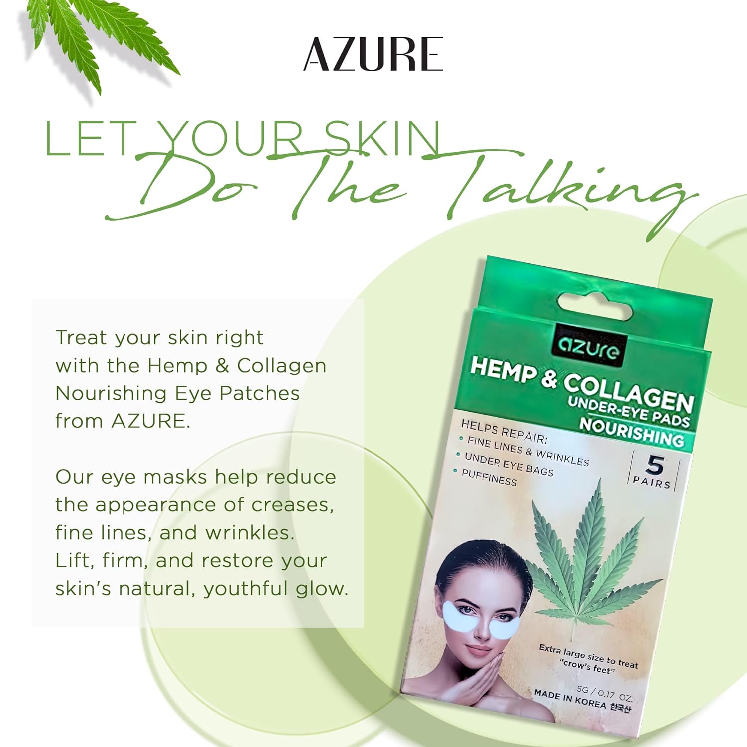 AZURE Hemp & Collagen Nourishing Under Eye Pads - Toning, Hydrating & Anti Aging Eye Mask Patches - Reduces Fine Lines, Wrinkles, Dark Circles & Puffiness - Skin Care Made in Korea - 5 Pairs