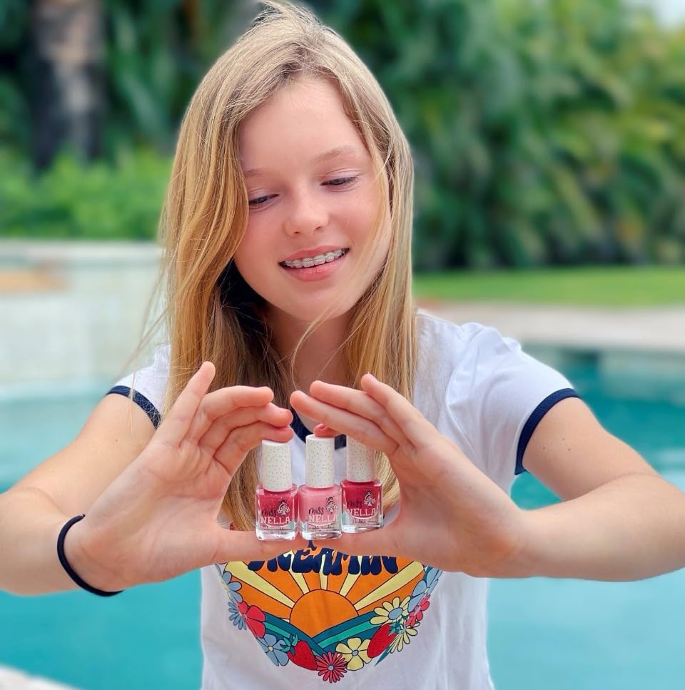 - GREAT SHADES: All kids are drawn to bright and happy colours, which is why Miss Nella’s nail polishes comes in a great range of shades with fun names that you can never forget: Sugar hugs (glittery see through pink), Cheeky Bunny (light shimmery pink) & Tickle me (dark shimmery pink)