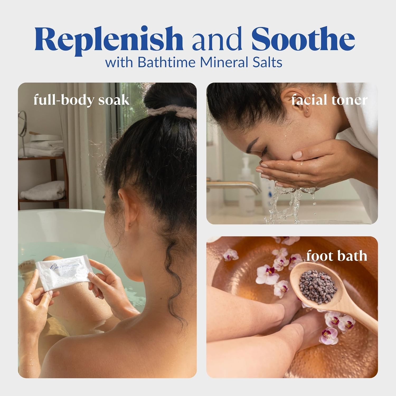- + BATHTIME MINERAL SALTS + 100% Himalayan mineral-rich salts, known for their natural sulfur aroma, provide a rejuvenating soak. Ideal for stress relief and muscle relaxation. Add a few drops of essential oils to enhance your experience. Can be used as a facial toner to a foot bath.