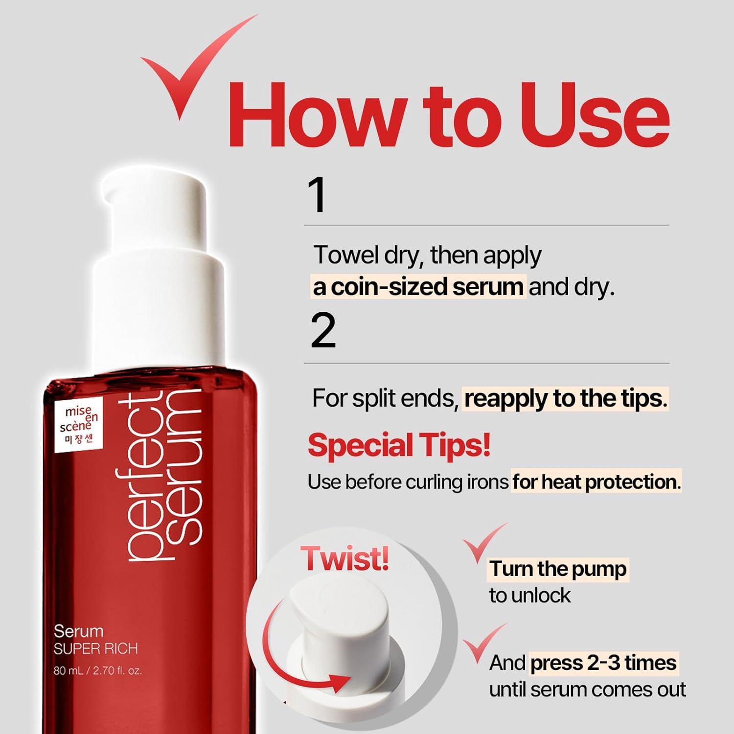 Mise En Scene Perfect Super Rich Serum with Argan Oils - Hair Essence for High Nutrition Intensive Care, Korean Hair Oil, 2.70 fl. Oz
