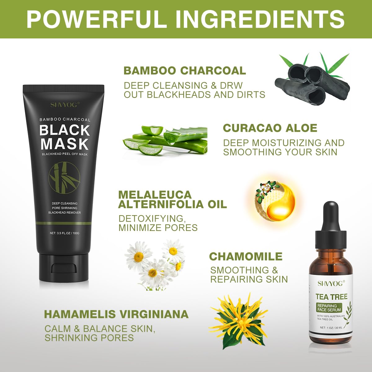 - 【BLACK MASK & TEA TREE SERUM KIT】 - The best SHVYOG blackhead remover mask makes your daily skin care routine complete. This new upgrade combination contains blackhead peel off mask and natural tea tree repairing serum for your convenience. Comes with a brush to help charcoal face mask application. Our black mask can be gifted to women, men and be a gifts to yourself