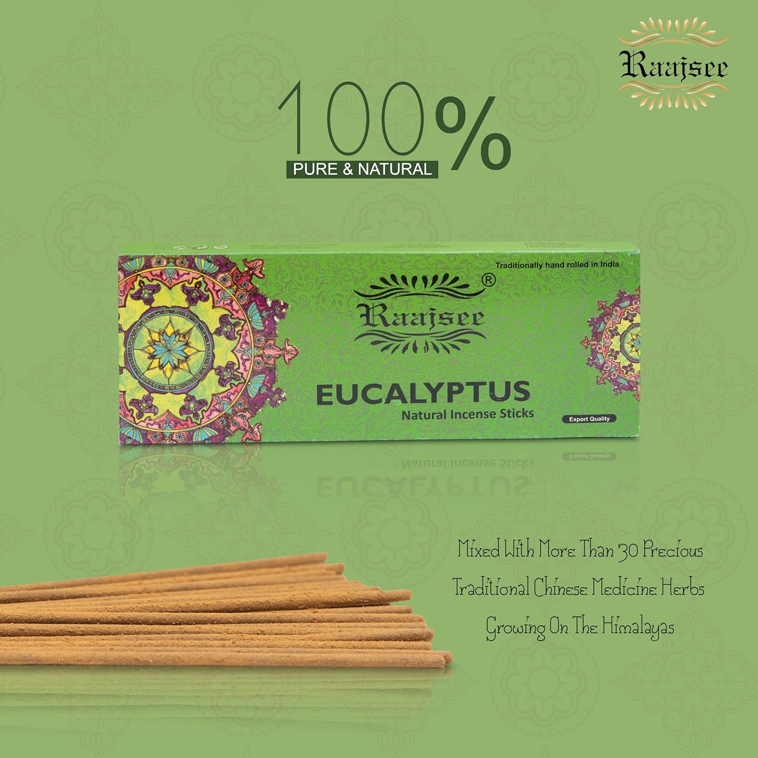 Raajsee Incense Sticks Eucalyptus 100 gm Pack-100% Pure Organic Natural Hand Rolled Free from Chemicals-Perfect for Church, Aromatherapy,Relaxation,Meditation,Positivity & Sensual Therapy