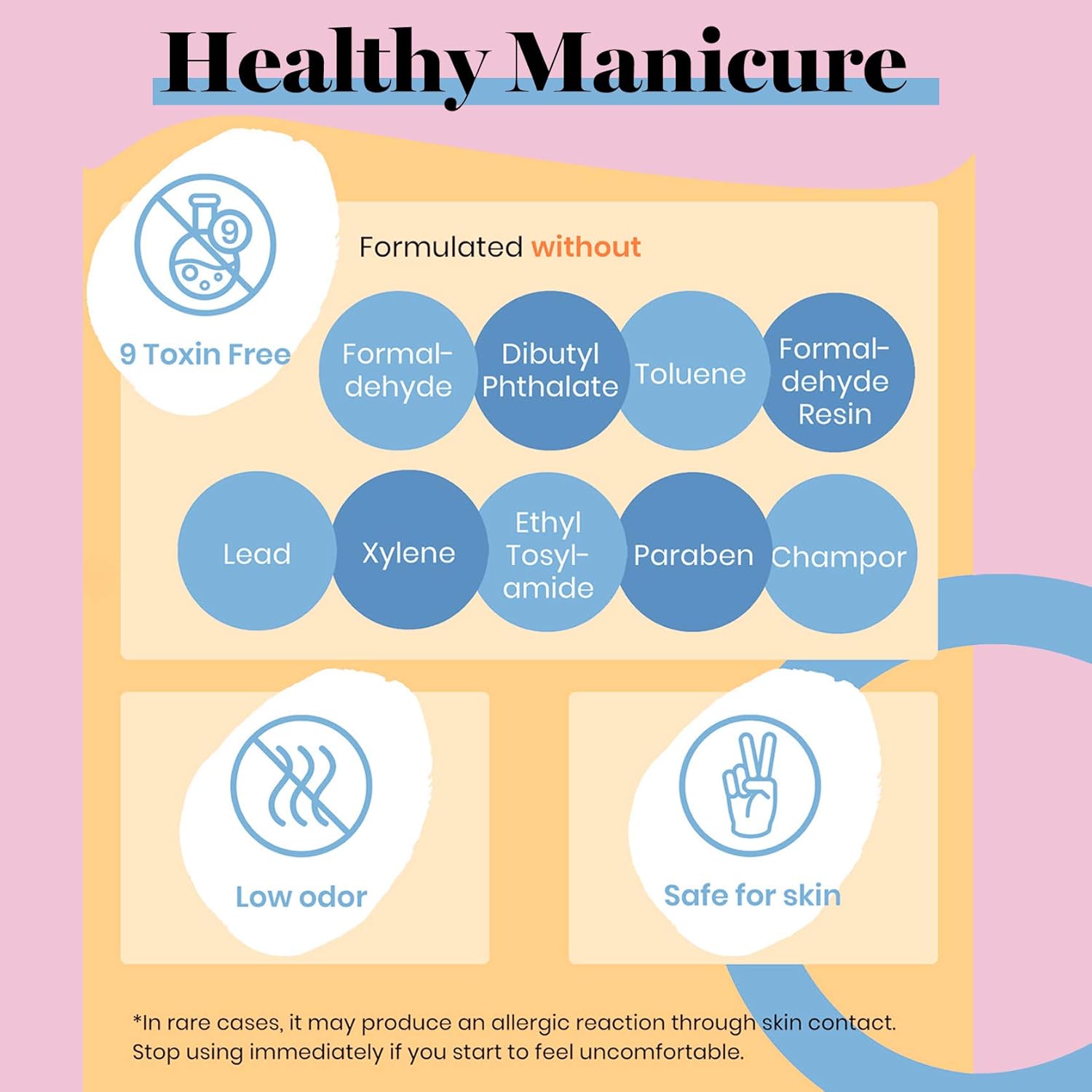 - ăEnvironmental & Healthyă: 9 Toxin Free Ingredient makes it healthy and low odor. No harsh ingredients or adhesives that lead to damaged nails.