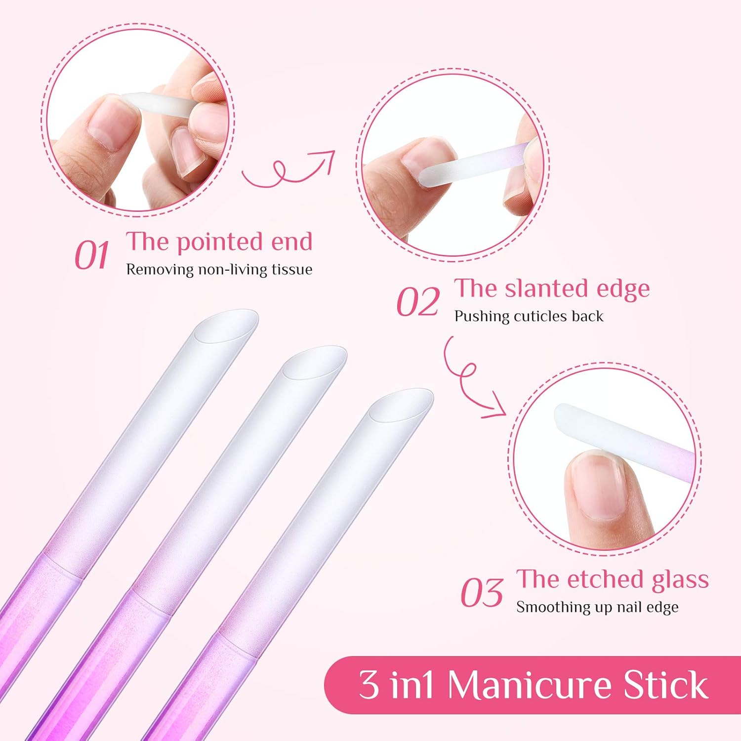 - 3 in 1 feature: this double sided glass cuticle pusher is designed for many uses; The pointed tip gently removes dead skin and dirt from nail edges, while the slanted edge is nice for pushing back cuticles and exfoliating under the nail fold; Both sides feature etched glass that smooths nails to a refined shape, promoting the growth of long, healthy, and beautiful nails.