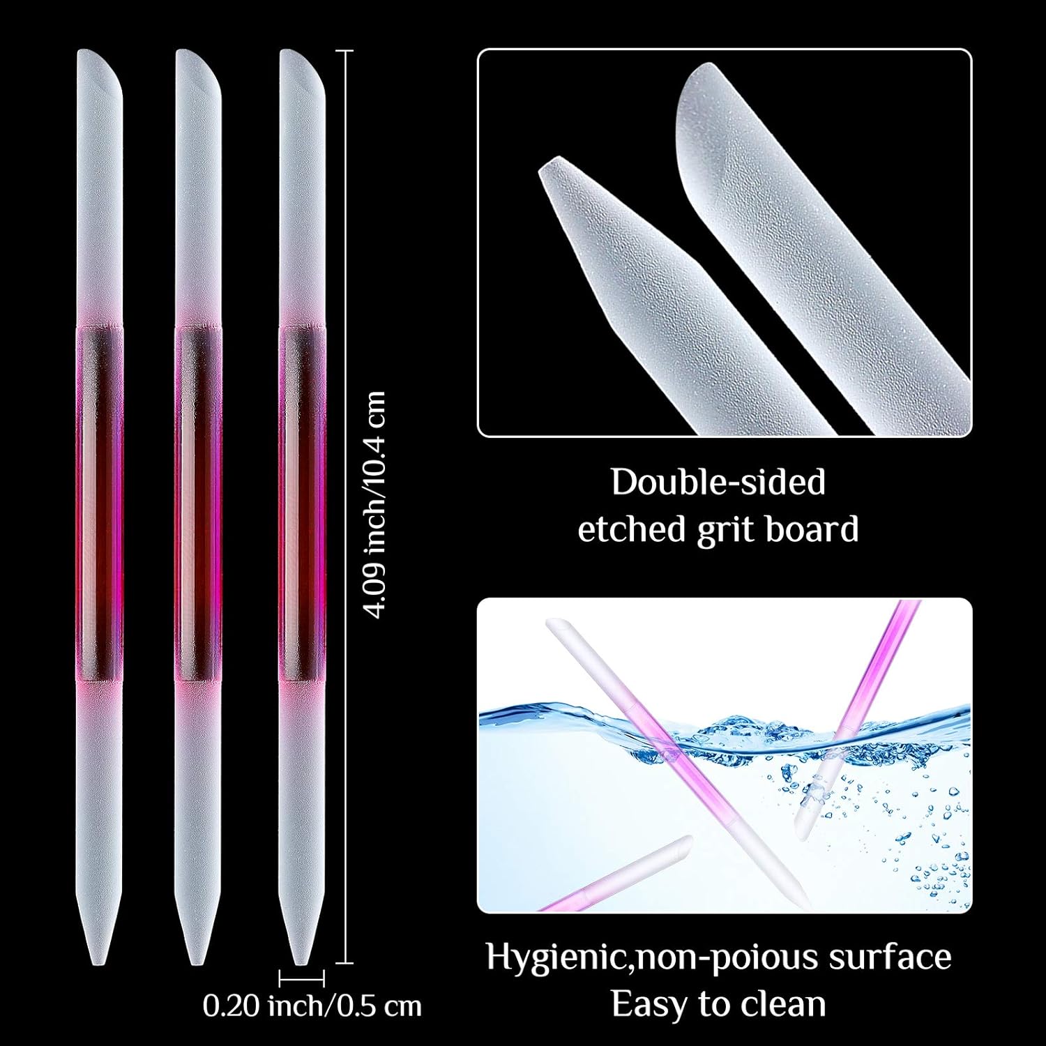 - Glass Material: constructed from glass, these glass cuticle sticks are durable and easy to maintain; The dual ended etched grit board ensures they remain sharp and effective without dulling or rusting, and they are gentle on healthy skin