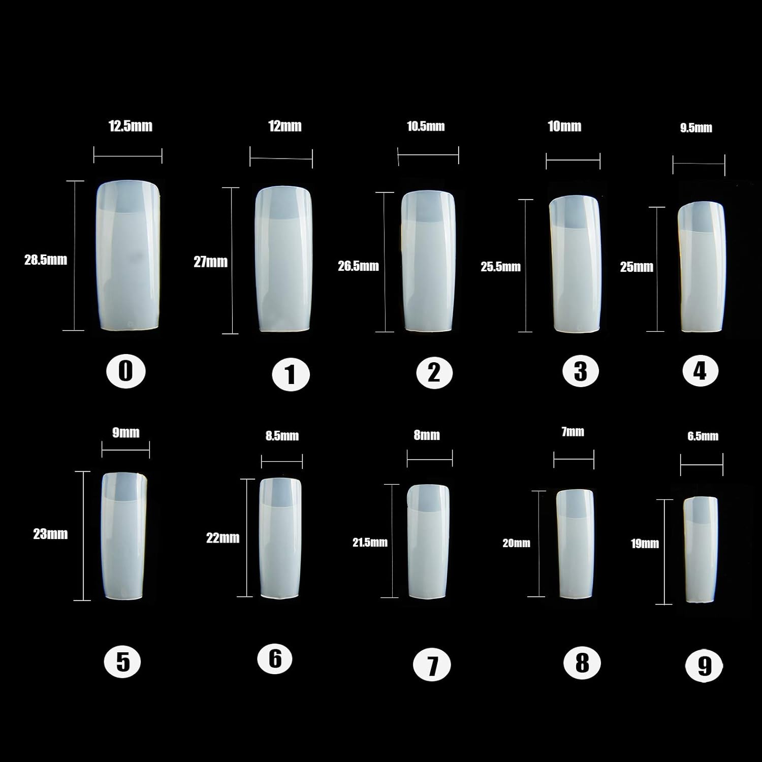 - Half-covered false nail tips, 500pcs nail tips, 10 different sizes, stored in numbered case with 10 small grid.