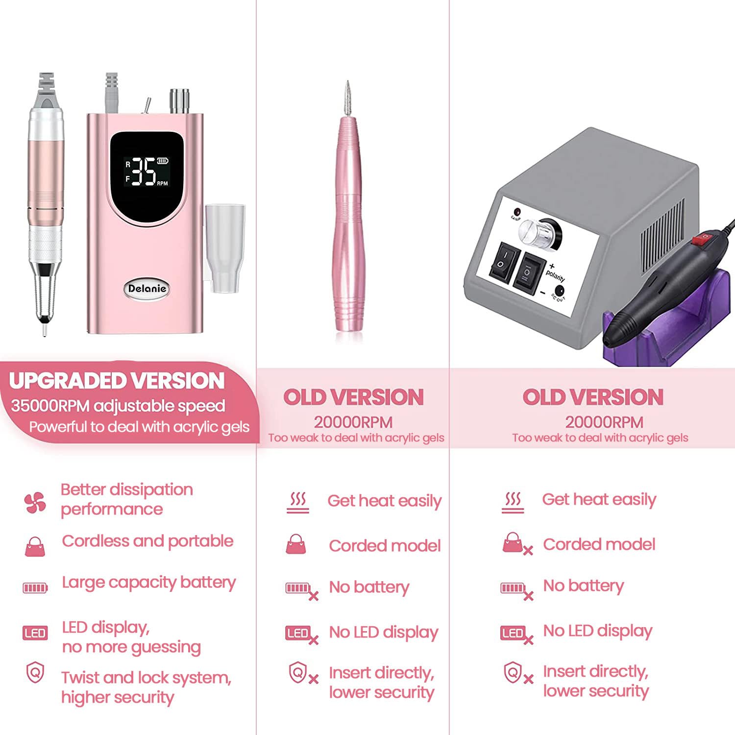 Delanie Professional Portable Electric Nail Drill Machine, 35000 RPM Rechargeable Cordless Nail Filer Electric Nail File Efle for Dip Powder Acrylic Gel Nail, Salon Nail Tool, Rose Gold