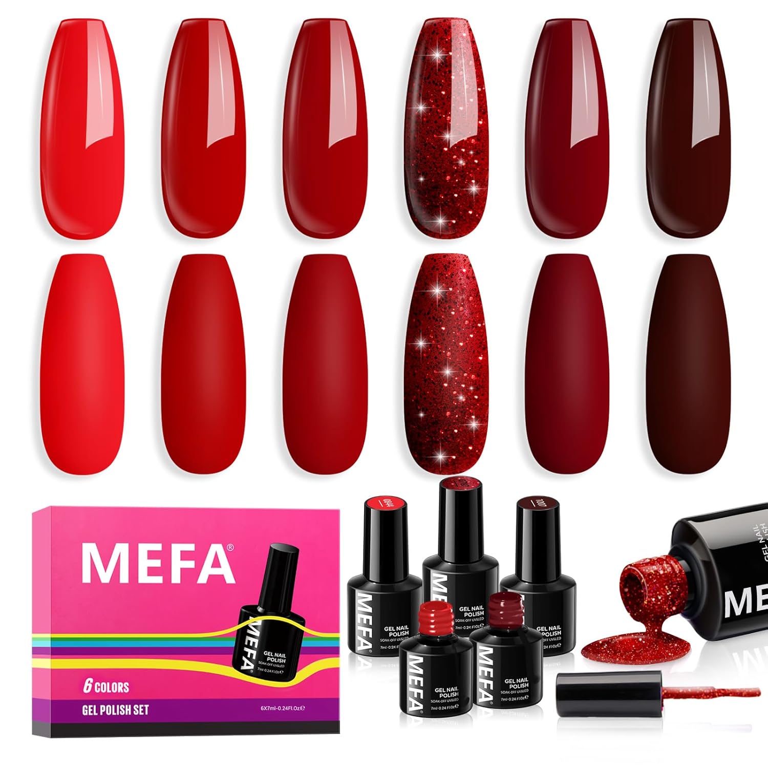 MEFA Red Gel Nail Polish Set, 6 Colors Gel Polish Kit Popular Burgundy Glitter Nail Polish Soak Off Rose Dark Red Shimmer DIY Home Salon Manicure Gifts for Women Girls 2025