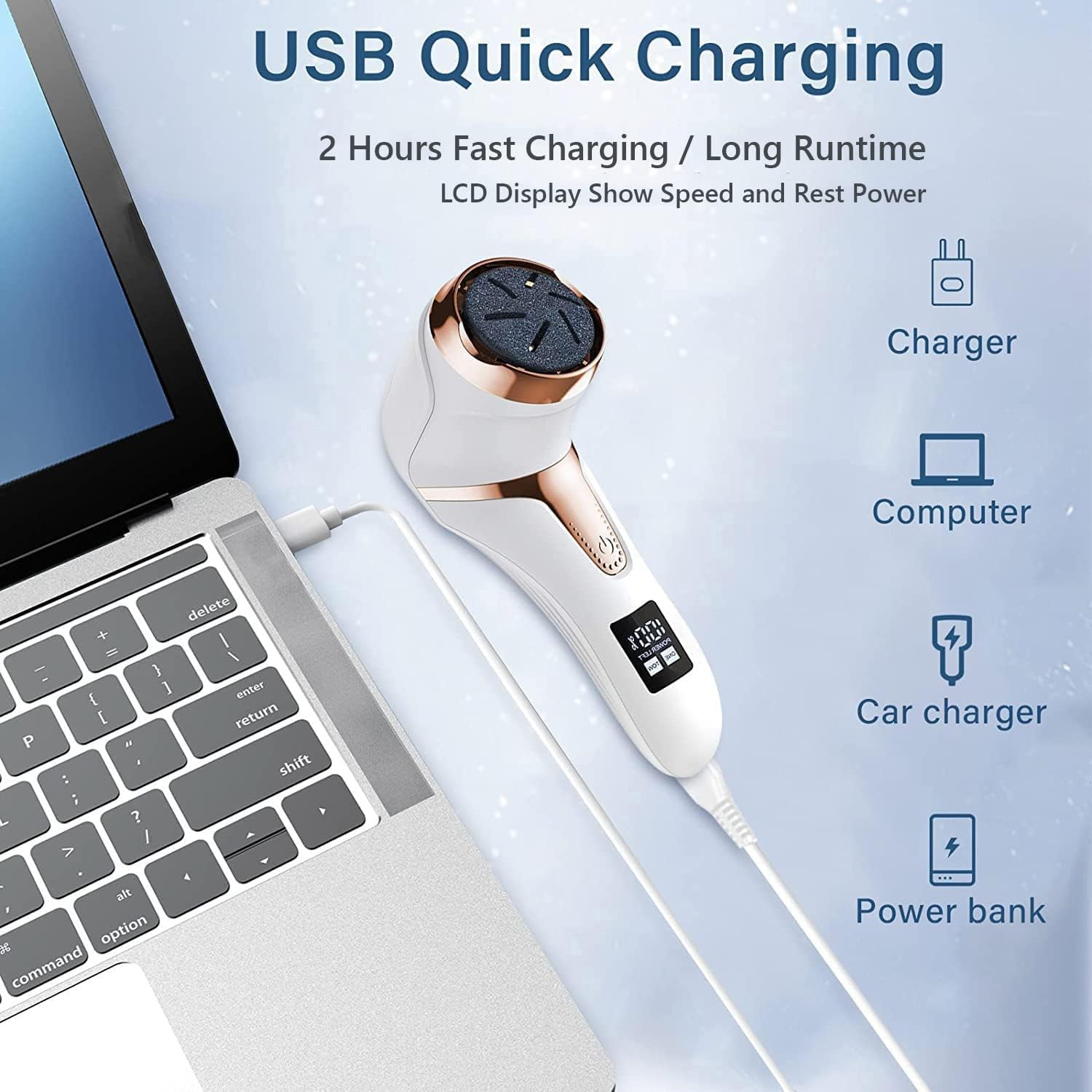 - Rechargeable, Long-Lasting, Easy to Use ----Included USB charging cable, This electric foot file can be charged via any USB port, and have a long runtime 2hours after full charged .and this dead skin remover for feet have LCD Power display let you clear know the rest power it left. remind you charge in time