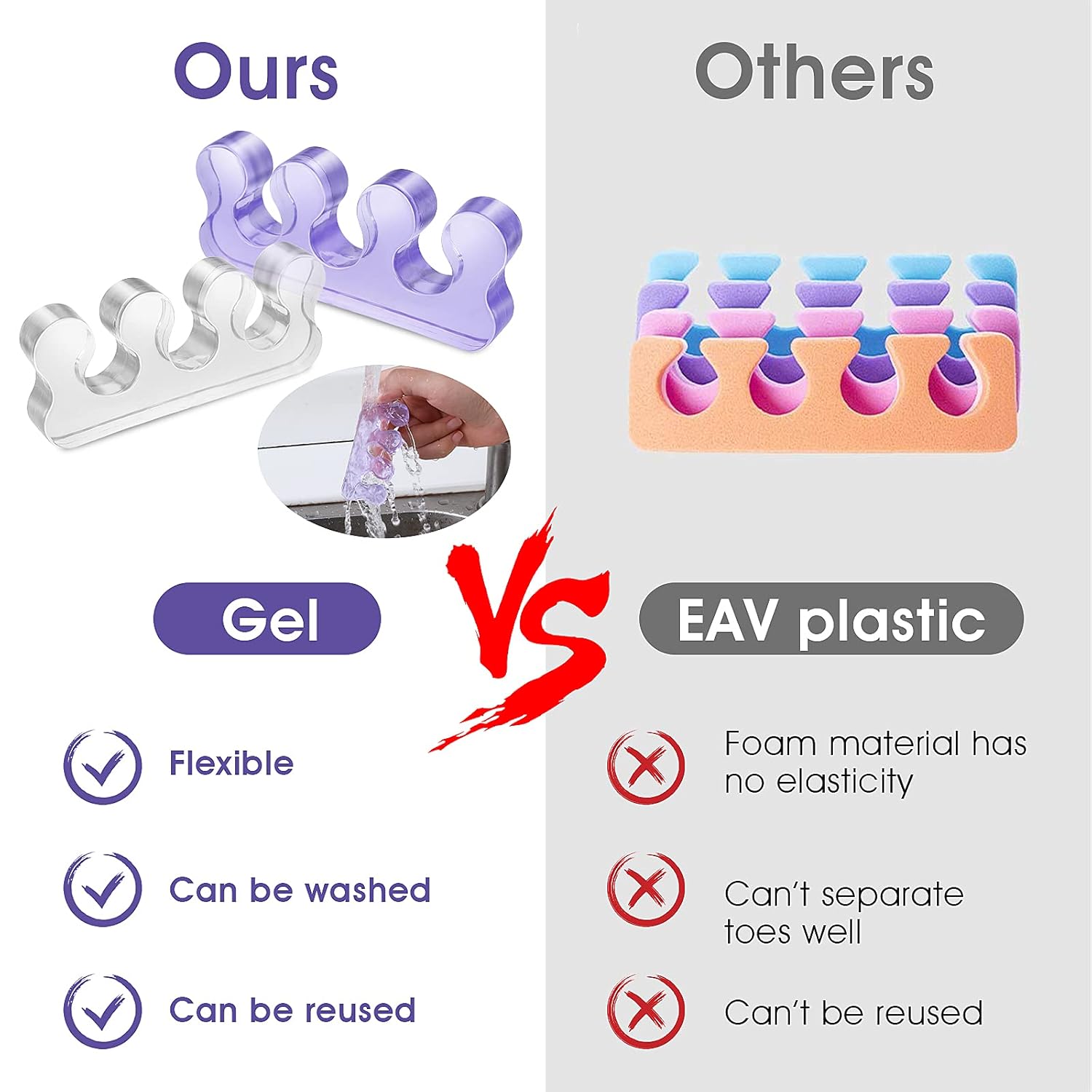- 【Reusable】: Foam toe spacers enhanced edition,toe separators gel can be repeatedly cleaned and soak in the water for a long time,is not deformed in quality after repeated usage.Please wash pedicure separators with clean water before using