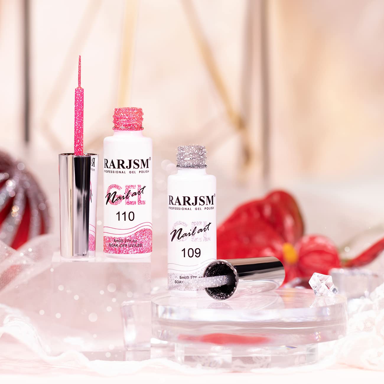 - EASY TO APPLY SMOOTH:Package include 2 different color painted art gel polish,silver glitter and hot pink glitter that are highly pigmented,easy to apply for perfect shiny nail art design.RARJSM soak off nail art gel liner painting polish set is made of smooth formula,low odor, no harm to skins and nails