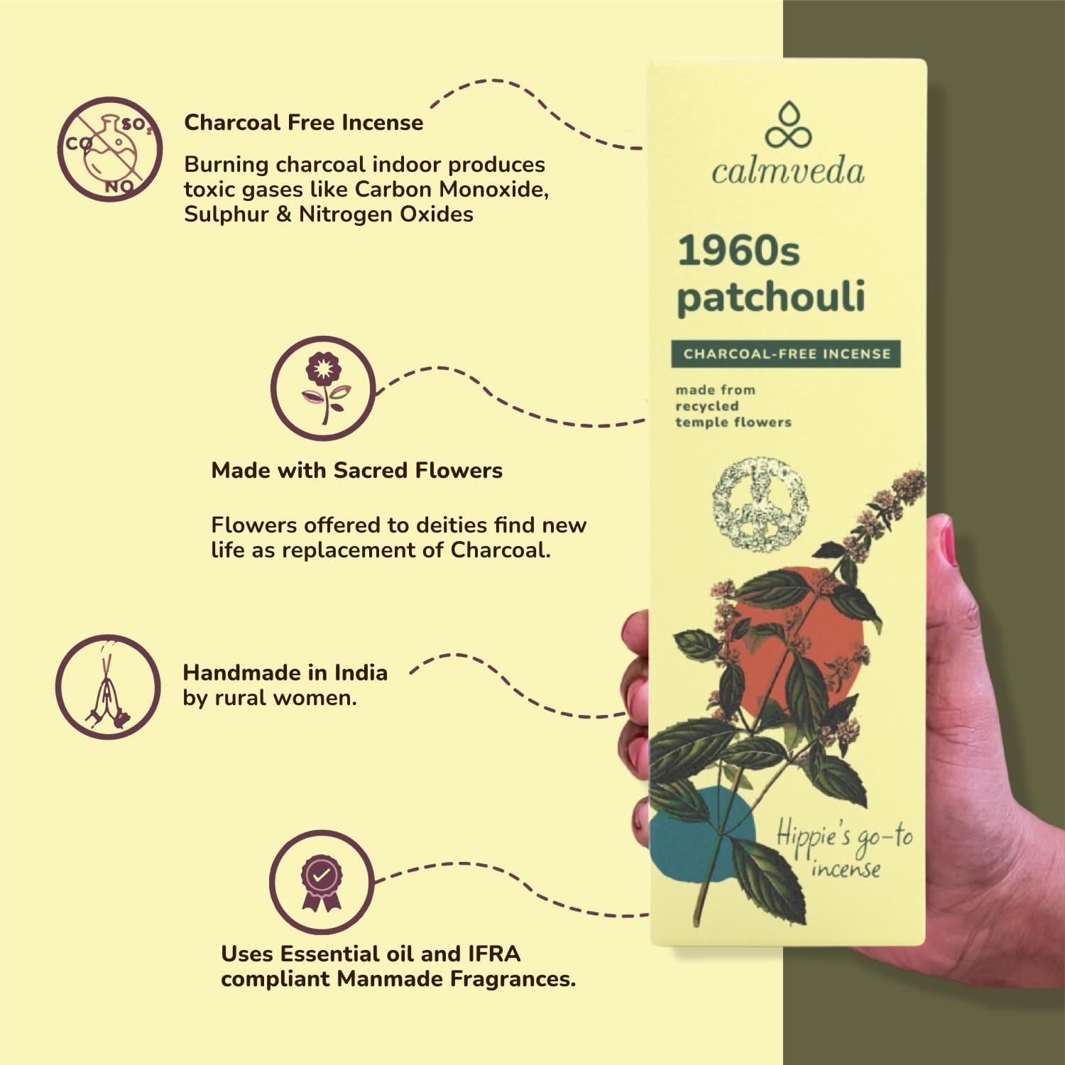 - BURN CLEAN CHARCOAL-FREE INCENSE : This pack of 80 sticks - 60s Patchouli incense uses flower powder instead of Charcoal, hence a clean home fragrance solution.