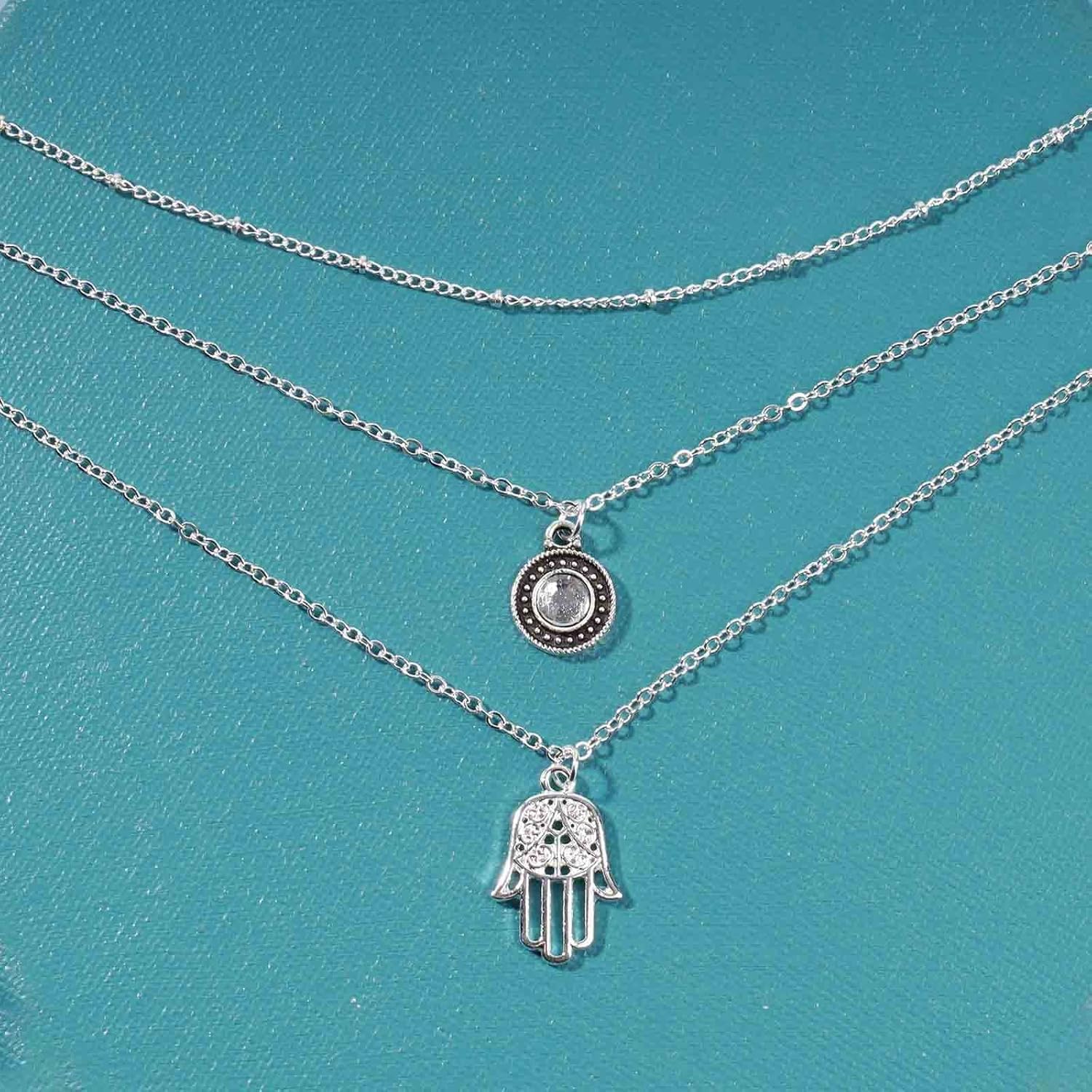 Boho Layered Opal Moonstone Necklace Silver Hamsa Pendant Necklace Futian Hand Necklace Chain Opalite Gem Necklace Jewelry for Women and Girls