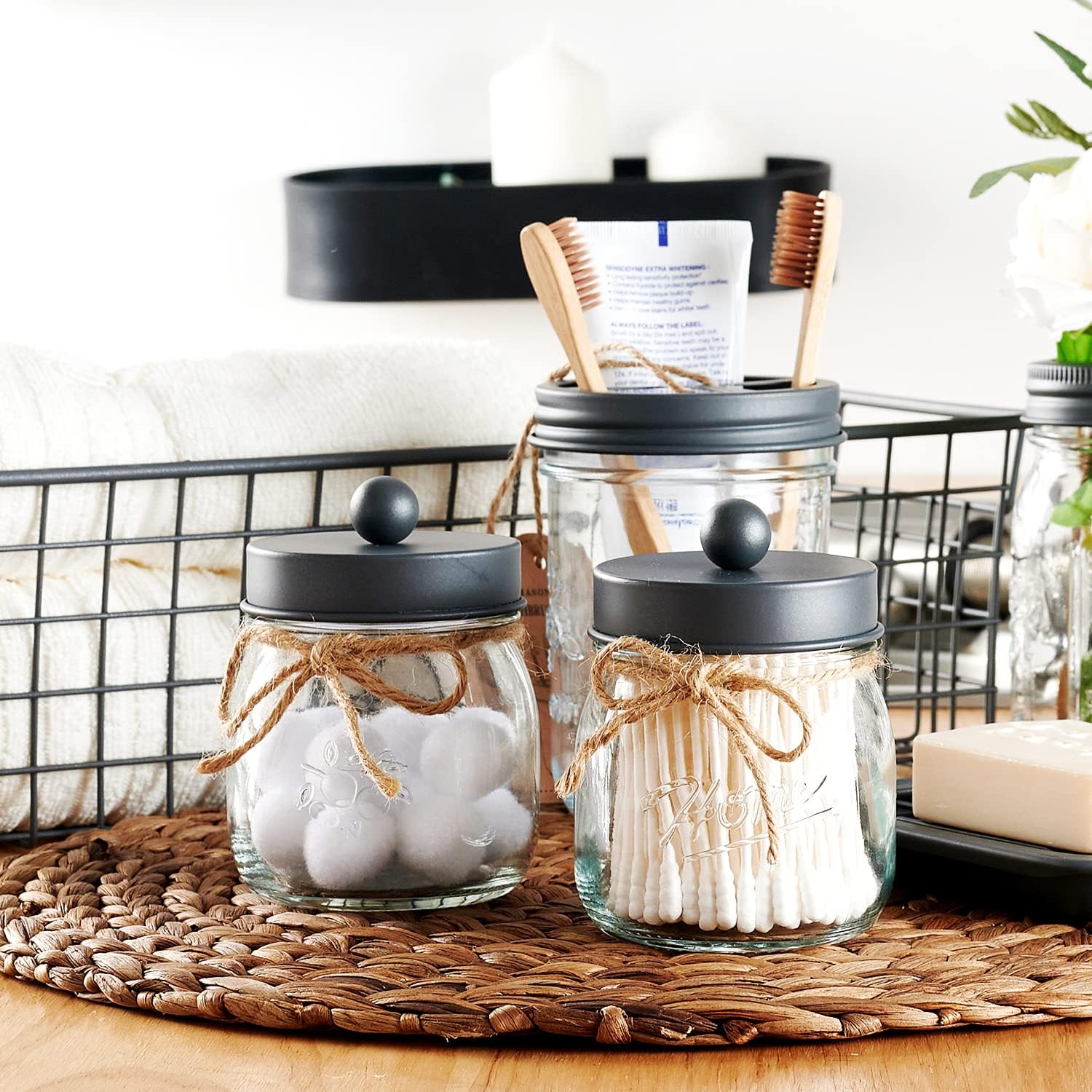 - ✔️Easy to Open and Close: This bathroom set includes two 8-ounce glass mason jars with standard-size metal lids. Perfect for any bathroom and they are small enough to fit neatly and keep by the sink and not get in the way or make the counter look cluttered. These lids provide a secure fit, an easy-open design, and rust-resistant properties. Please note: the lids are designed for a lift-off mechanism rather than a screw-on closure. It makes it so much easier to lift off the top and reach in for a cotton ball or cotton swab.