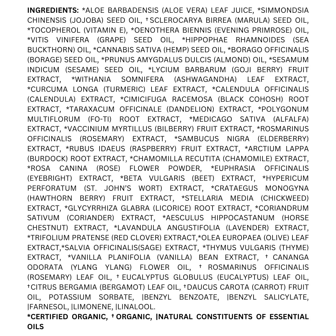 - Active Ingredients : *Aloe Vera Leaf Juice, *Jojoba Oil, †Marula Oil, *Vitamin E, *Evening Primrose Oil, *Grape Seed Oil,*Sea Buckthorn Oil, *Hemp Seed Oil, *Borage Seed Oil, *Almond Oil, *Sesame Oil, *Goji Berry, *Ashwagandha, *Turmeric, *Calendula, *Black Cohosh, *Dandelion, *Fo-Ti Root, *Alfalfa, *Bilberry, *Rosemary, *Elderberry, *Raspberry Leaf, *Burdock, *Chamomile, *Rose Hips, *Eyebright, *Beetroot, *St. John’s Wort, * Hawthorne Berry, *Chickweed, *Licorice, *Coriander, *Horse Chestnut, *Lavender, *Red Clover, *Olive Leaf, *Sage, *Thyme, *Vanilla Extract, †YlangYlang Essential Oil, †Rosemary Essential Oil, †Eucalyptus Essential Oil, †Bergamot (FCF) Essential Oil, †Carrot Essential Seed Oil, Potassium Sorbate *Aloe Vera Leaf Juice, *Jojoba Oil, †Marula Oil, *Vitamin E, *Evening Primrose Oil, *Grape Seed Oil,*Sea Buckthorn Oil, *Hemp Seed Oil, *Borage Seed Oil, *Almond Oil, *Sesame Oil, *… See more