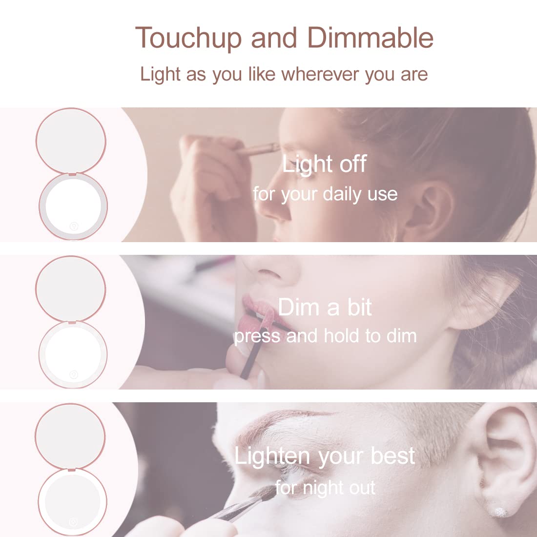 - 【Rechargeable LED Compact Mirror】: Lighted compact mirror with LED light is rechargeable. Soft LED ring light simulates daylight help you to create the flawless makeup. Elegant design for all the occasions such as daily use, party, date or travel.