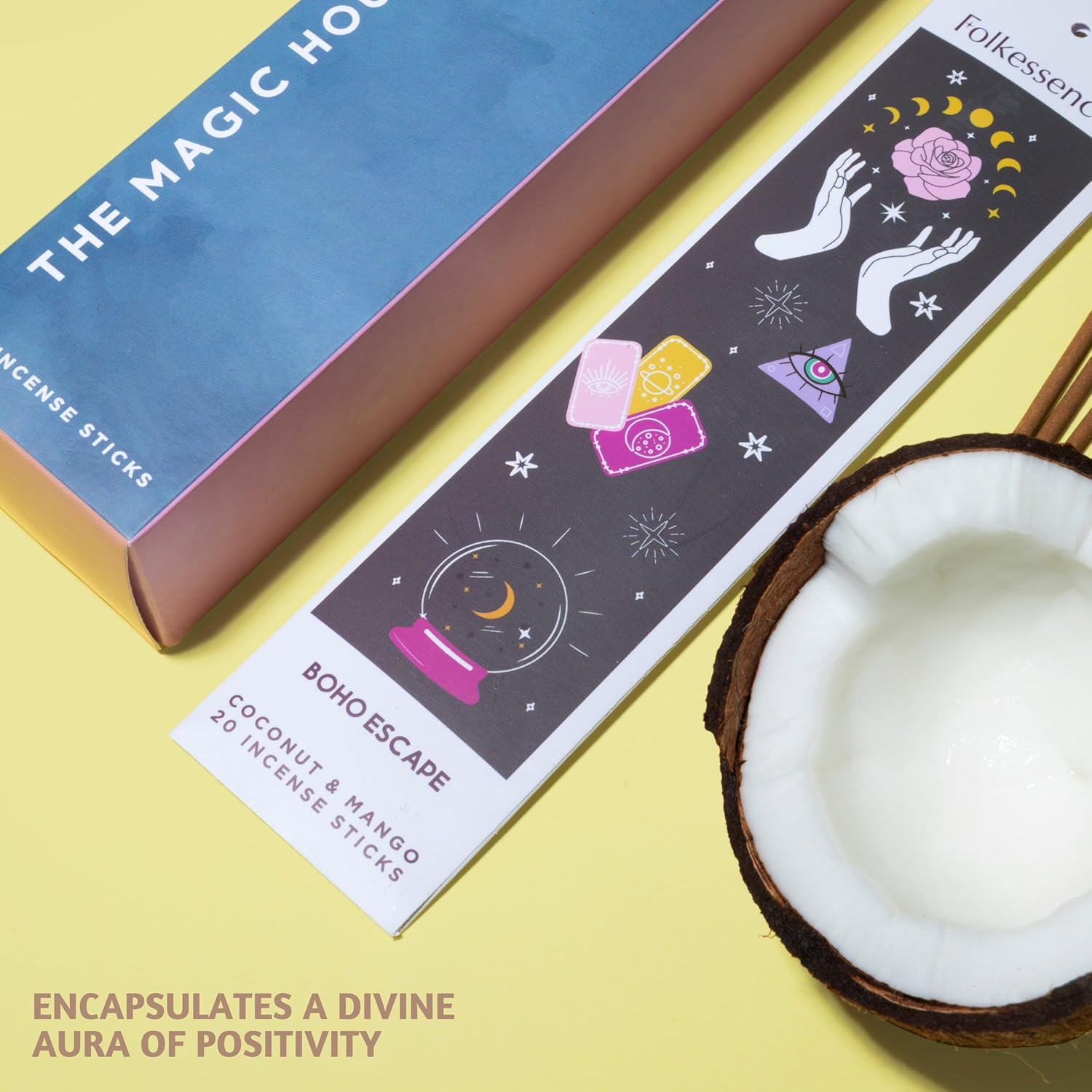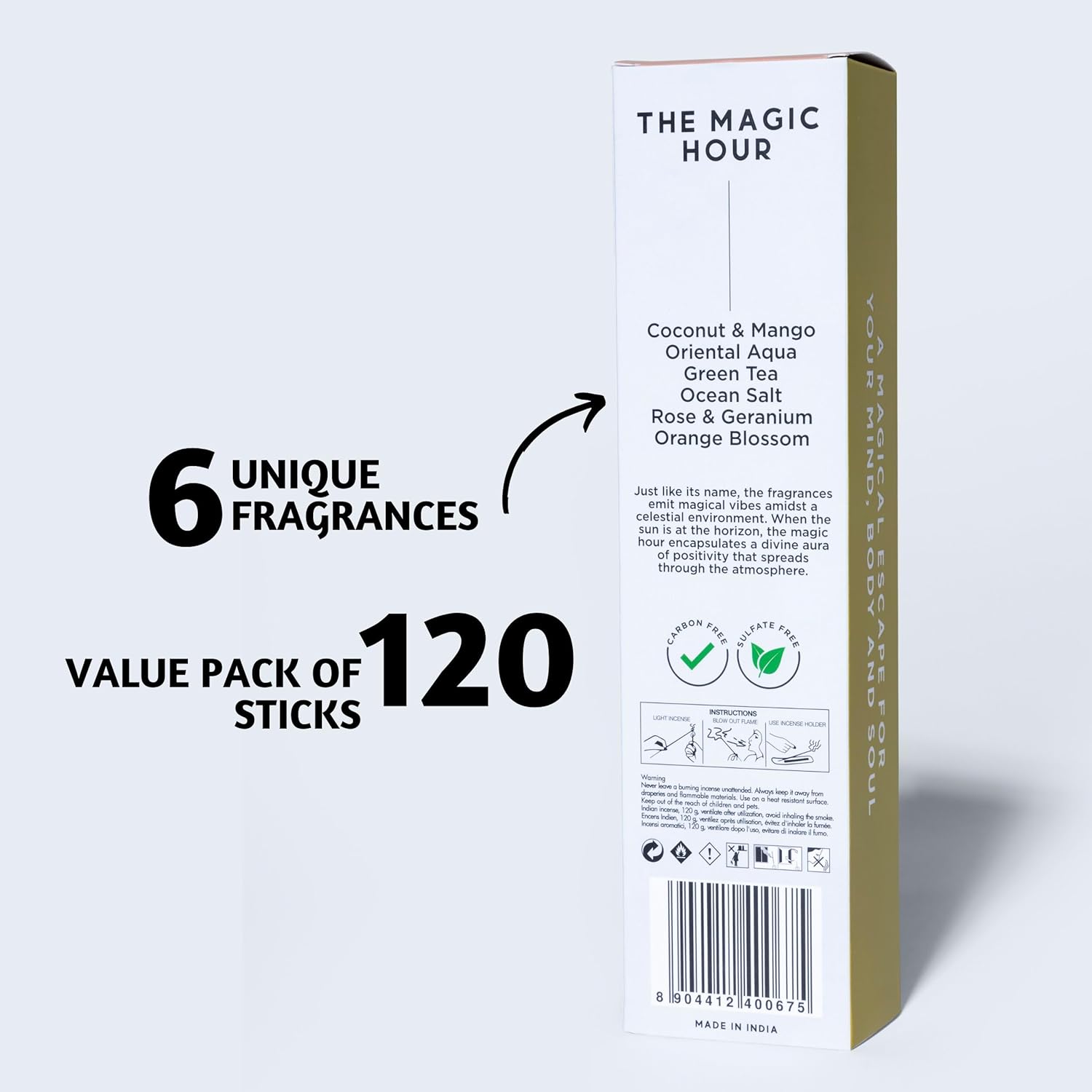 Folkulture Incense Sticks | Set of 6 (120 Organic Insence-Sticks) for Positive Aura with 45 Mins Burn Time | Non Toxic Coconut Mango, Aqua, Green Tea, Rose Geranium, Orange Blossom Inscents-Sticks