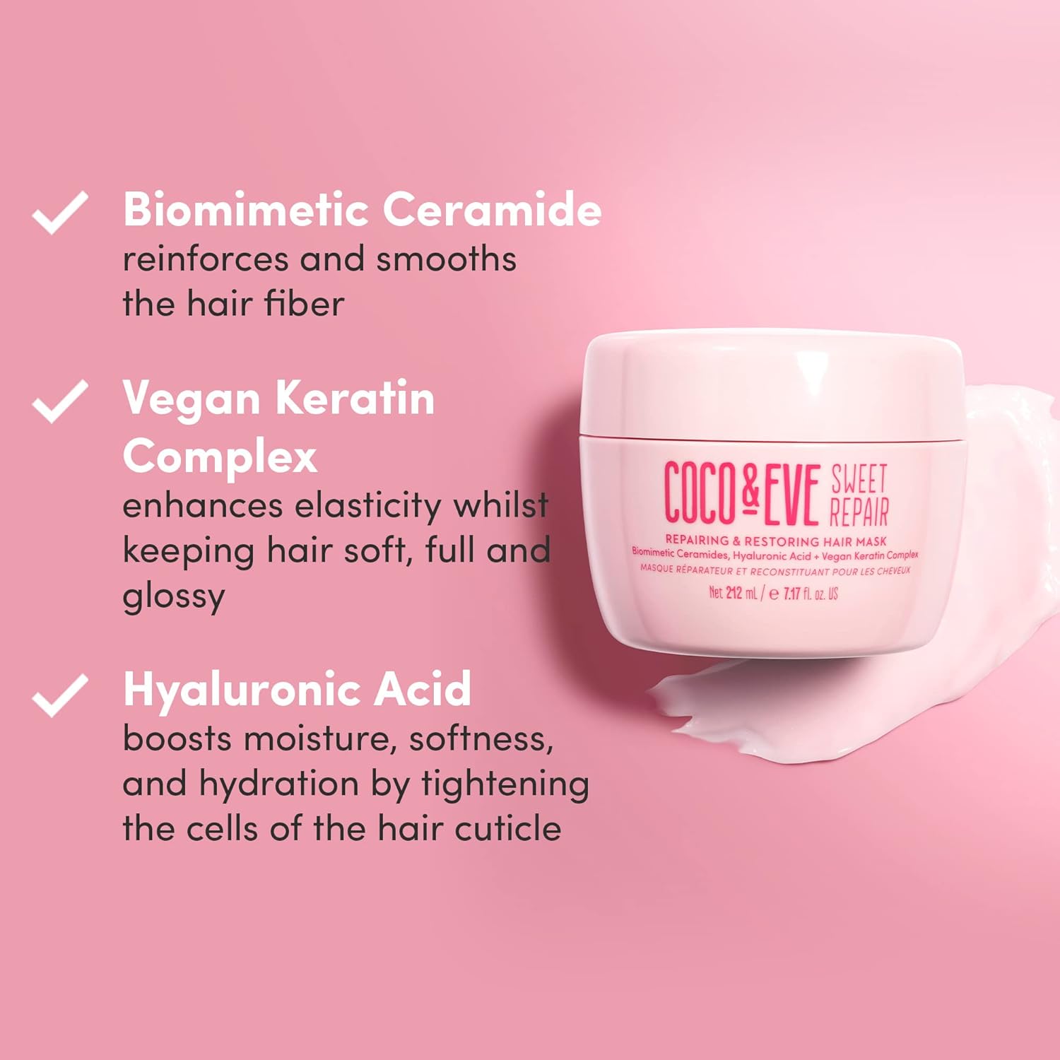 Coco & Eve Sweet Repair Repairing and Restoring Hair Mask. 85% stronger hair, reduce hair damage by 65%. Biomimetic Ceramides, Hyaluronic Acid, Vegan Keratin. Increase Hydration & Shine.