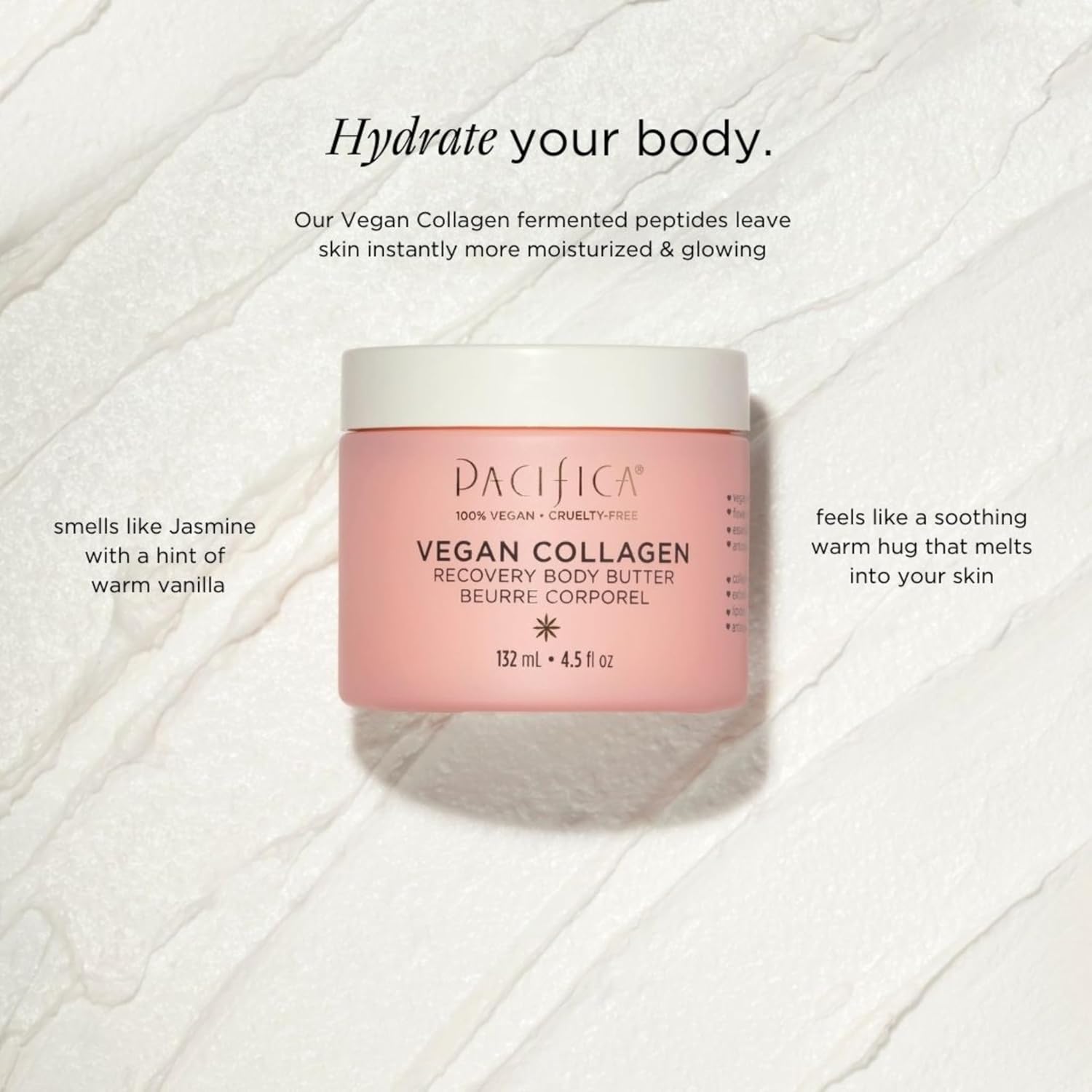 - VEGAN COLLAGEN BODY BUTTER your body deserves to be treated just like your face, so we have created your new hydration salvation. Our Vegan Collagen Body Butter is infused with our signature vegan collagen and floral extracts to help support elasticity and provide intense moisture to dull & dry skin. This rich, scoopable formula is perfect for targeting skin that needs extra hydration.