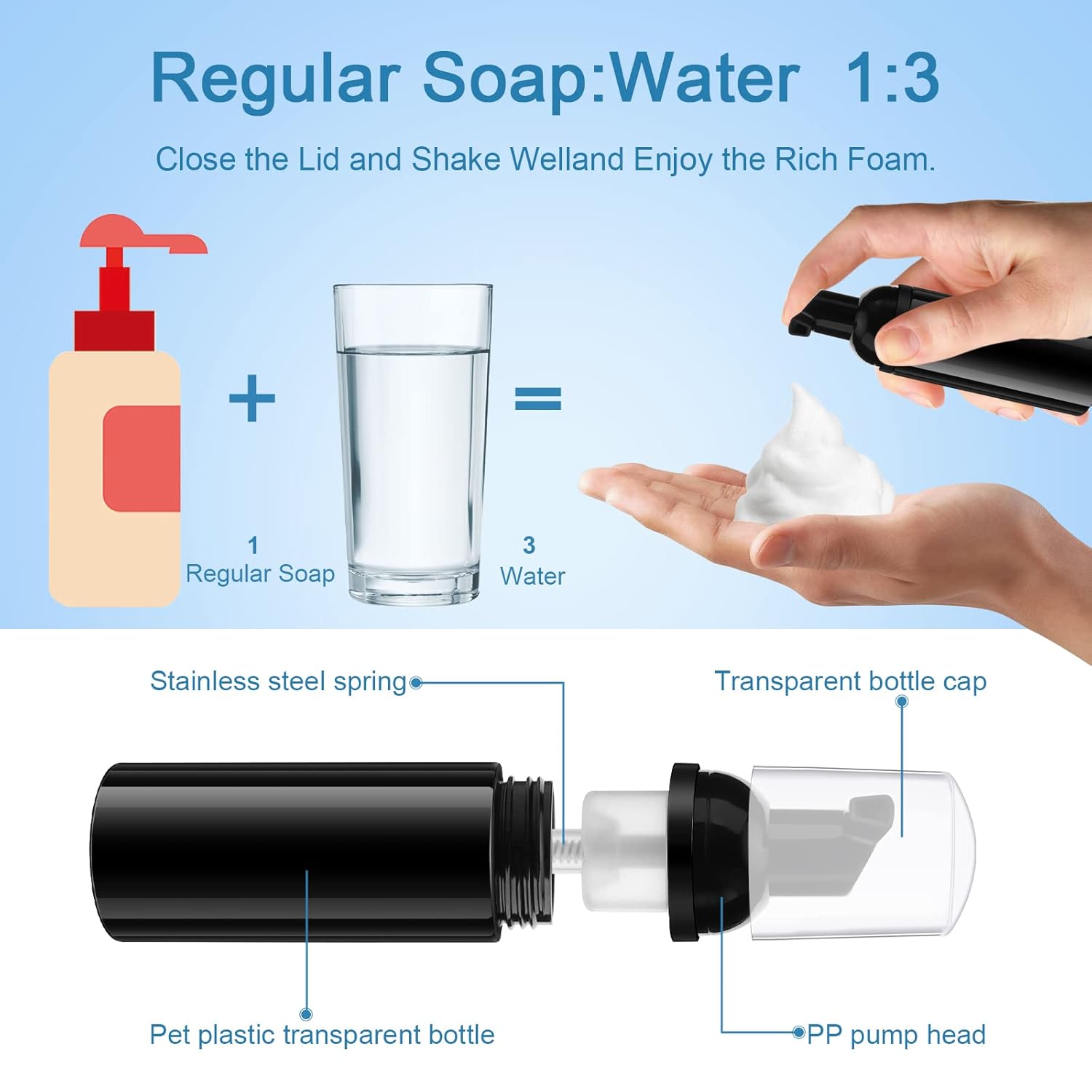 - ăPortable Eyelash Shampoo BottlesăThese about 60ml foam pump bottles are made of PET material, and the spring-loaded button ensures that there is enough liquid to spray into a foam. You can make your own lash cleanser as a gift to a new client's lash extension cleanser. It is also the perfect container for trips, excursions, trips.