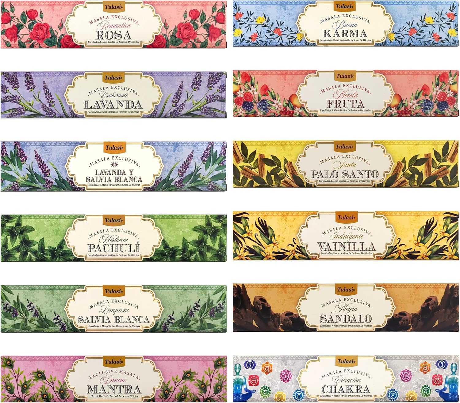- SET INCLUDES: 180 incense sticks (12 x 15 Pc). This Tulasi Incense Stick Gift Pack includes 12 different fragrances boxes, each box contains 15 sticks | Romantic Rose, Lush Lavender, Lavender & White Sage, Herbal Patchouli, Cleansing White Sage, Divine Mantra, Good Karma, Mix Fruit, Holy Palo Santo, Indulgent Vanilla, Black Sandalwood, Healing Chakra