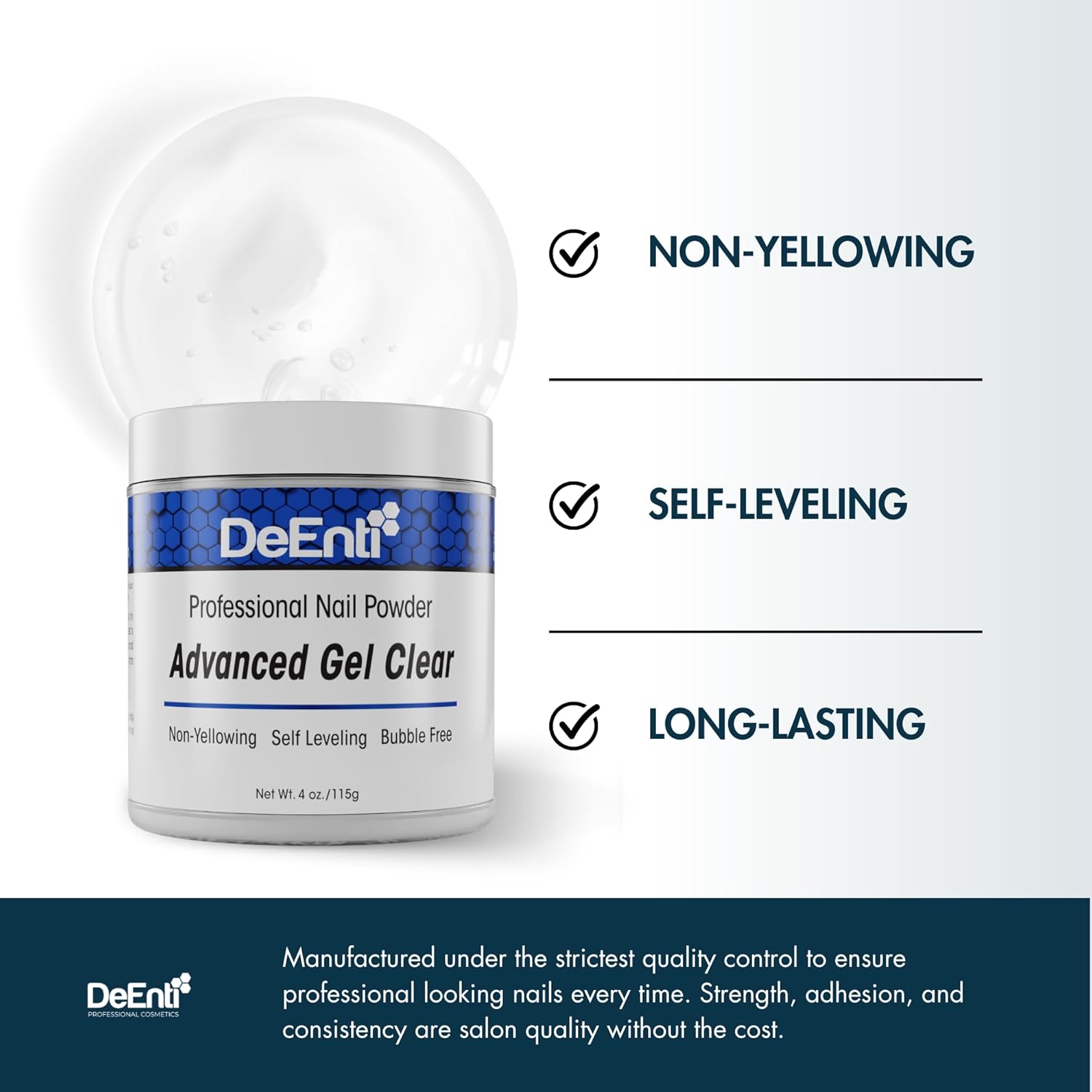 - NON-YELLOWING & SELF LEVELING formula creates smooth, shiny nails without excessive filing and prep. Manufactured under the strictest quality control to ensure professional looking nails every time. Strength, adhesion, and consistency are salon quality without the cost.