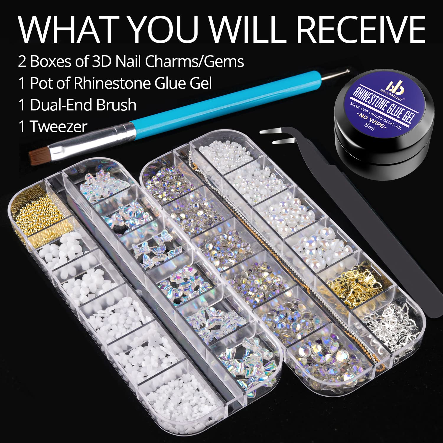 - WHAT YOU WILL RECEIVE -- The package contains 2 boxes of ornaments for manicure and 1 pot of 8ml No Wipe rhinestone glue gel with necessary dotting pen and tweezer. The embellishment set includes bling starry AB gems for nails, AB white flatback pearls, metal ball chain, 3D blossom, 3D aurora butterfly / bow / bear / flower, etc.