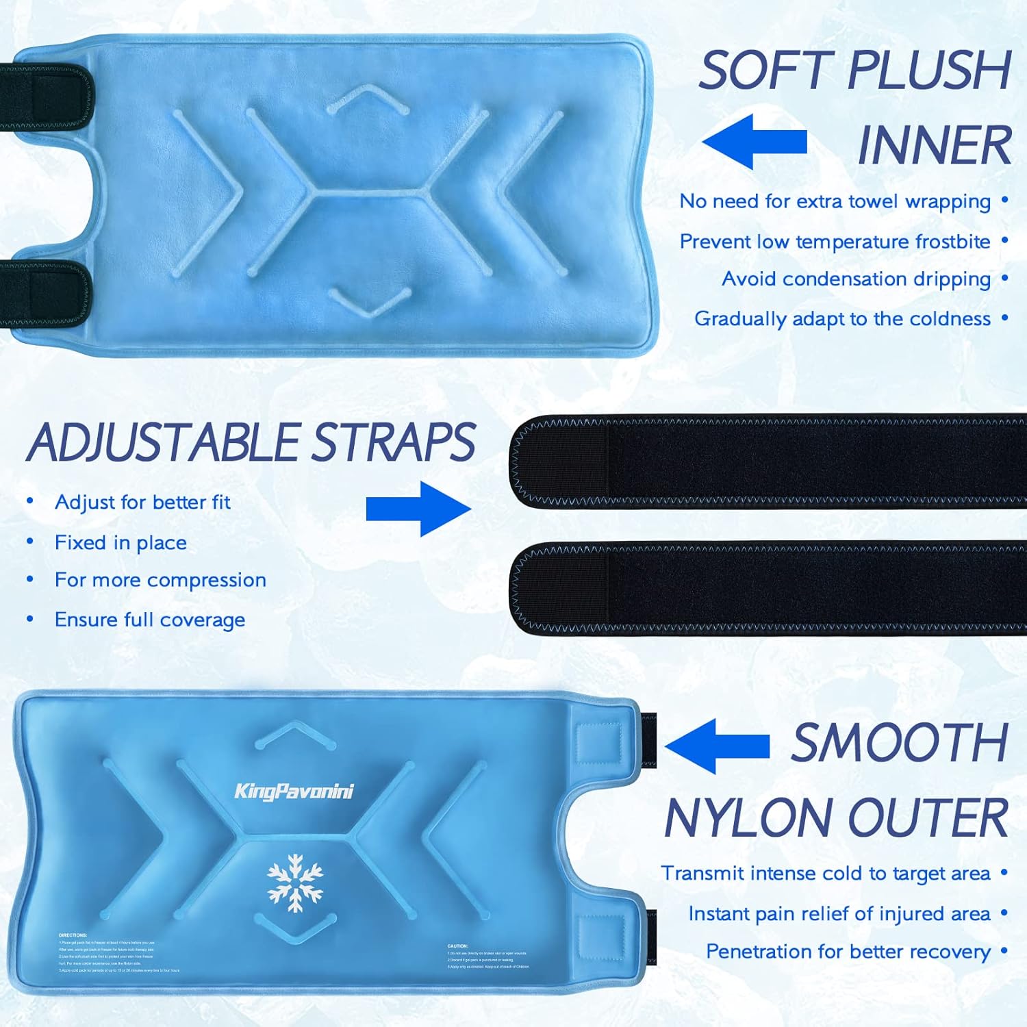 - 2 Levels Cold Therapy Effects: The plush side is soft to skin, which transmits soothing coldness to avoid condensation and frostbite without extra towel wrapping; The silky nylon side provides stronger coldness for quickly effective pain relief. It is recommended to use the plush side in the first few minutes to help the skin gradually adapt to the cold.