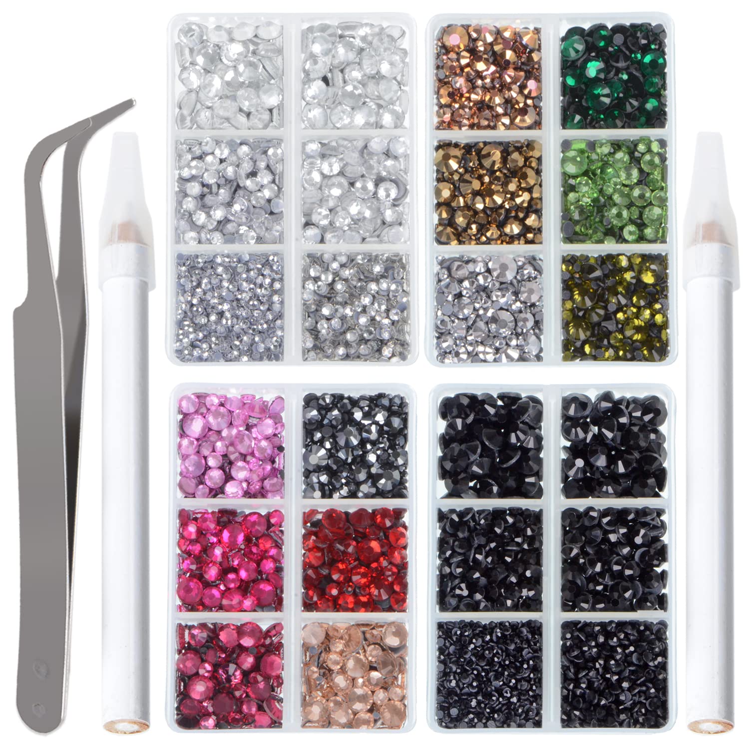 - 4 Boxes of Rhinestone Sets: Clear and Black rhinestones 2500pcs each color. 5000pcs colored rhinestones in 12 colors, such as rose gold, golden, green, hot pink, red, silver ... 1 of tweezers, 2 picking rhinestones pens.