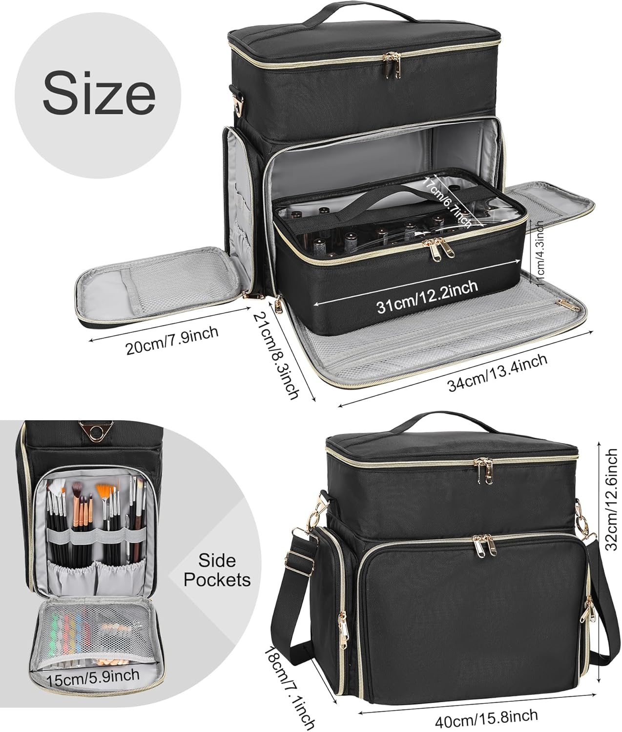 - Multifunction Pockets: Large capacity nail kit organizers and storage. The upper layer can hold the Nail lamp, glitters, nail drill kit,nail polish remover. Front pocket and 2 size pockets store your nail care tools, manicure set, nail brushes, nail Clippers,pedicure kit, makeup brushes, eyeshadow palette , etc.