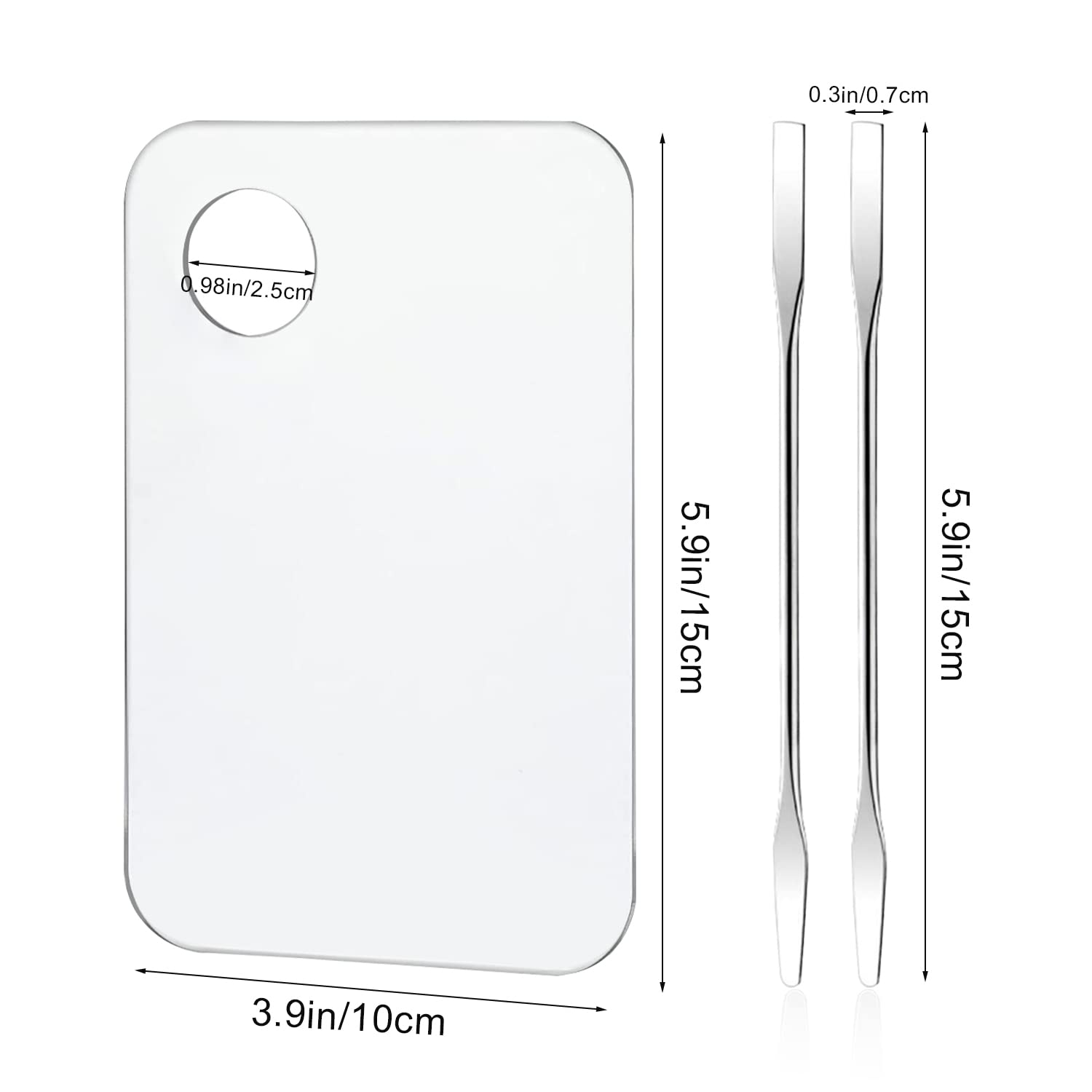 - ăPerfect SizeăFoundation palette:15Ă10cm/5.9x3.9inch,makeup spatula:15cm/5.9inch, it can fit your hands and let you have a gorgeous makeup, the exquisite package contains 2pcs acrylic makeup palettes and 2pcs stainless spatula, easy to fits your makeup bag, perfect size for traveling and taking along.