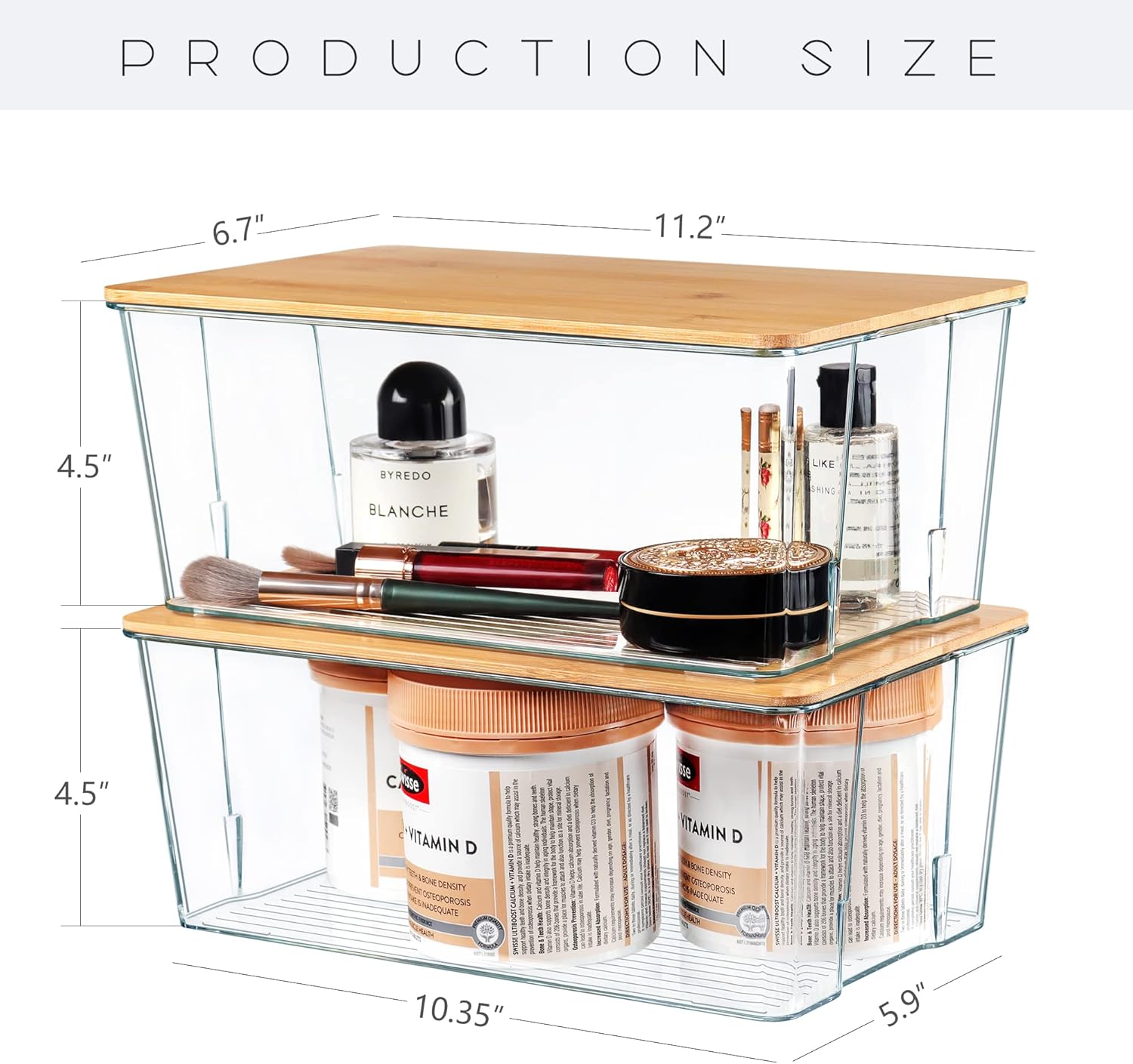 - THOUGHTFULLY SIZED - Come with 4 pack same size and each measure: Bottom length and width of each bin is about 10.35*5.9 inch, top's length and width is about 11.2*6.7 inch, height is Approx 4.5 inch