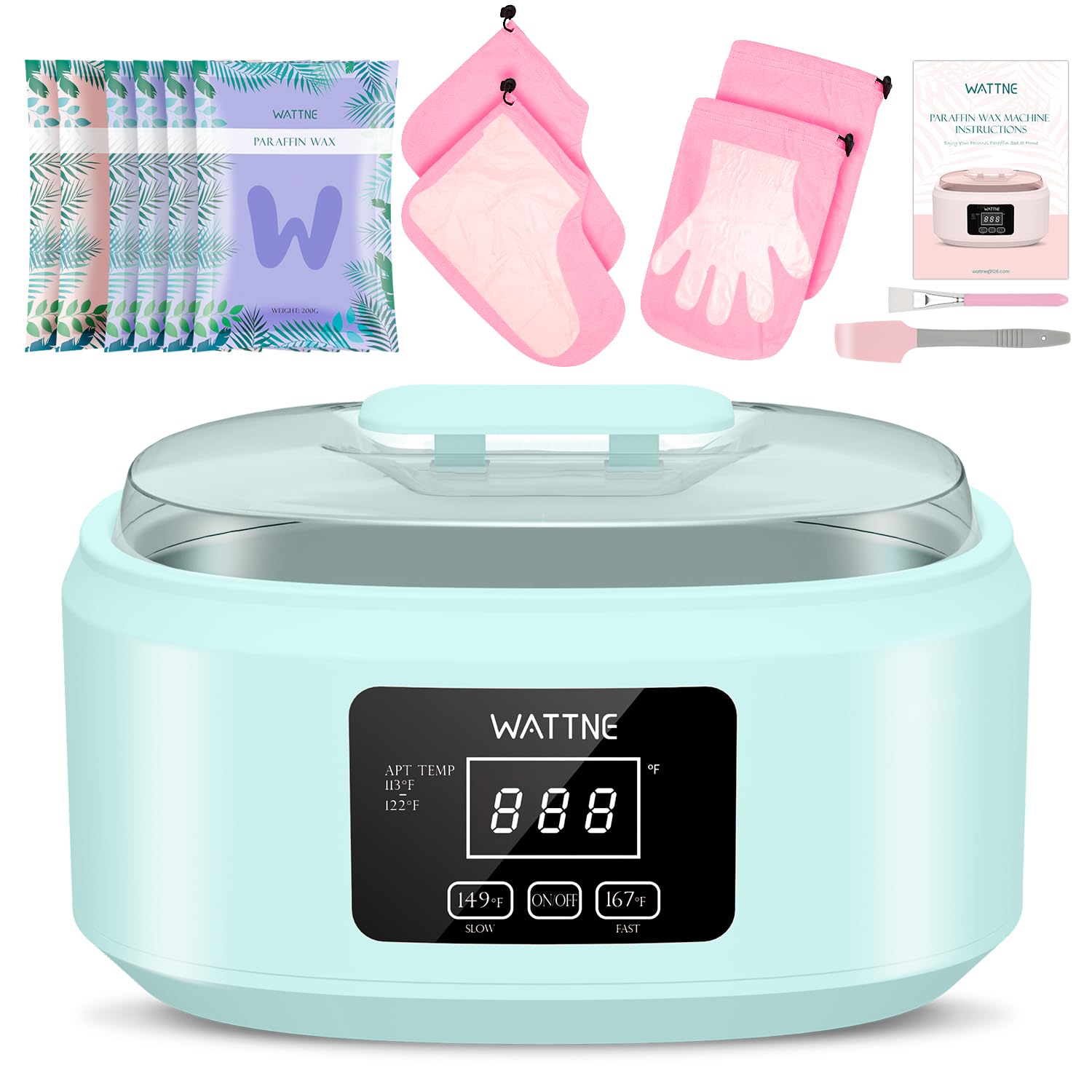 - Smart Temperature Control / Easy Operation: Place paraffin wax into machine and turn on the machine.Temperature setting "-" & "+",temperature range is from 149-167F.149F means lowering the temperature,167F means increasing the temperature.Wait for the 30mins,and you are ready to enjoy a paraffin spa treatment