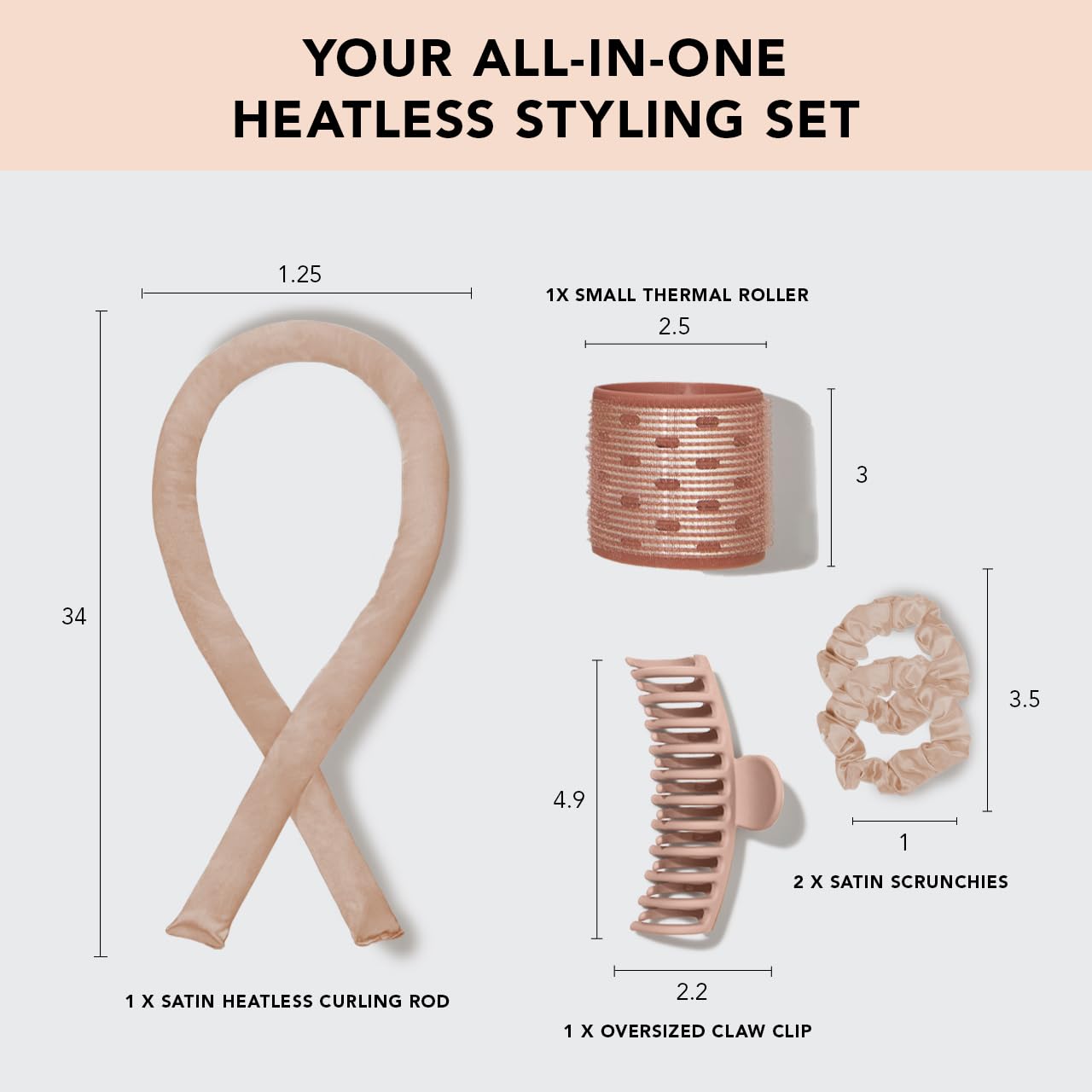 Kitsch Satin Heatless Hair Curler Styling 5pc Gift Set - Satin Heatless Hair Curler w/ 2 Scrunchies, Ceramic Thermal Roller & Claw Clip, Gifts for Women, Hair Roller Styling & Accessories- Champagne