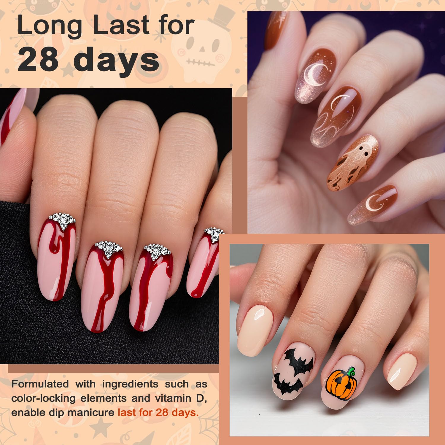 - Long Lasting: When applied correctly, the dip powder manicure can last for 3 WEEKS. Say goodbye to chipped nails with anti-chip and non-yellowing properties of this acrylic dip nails kit.