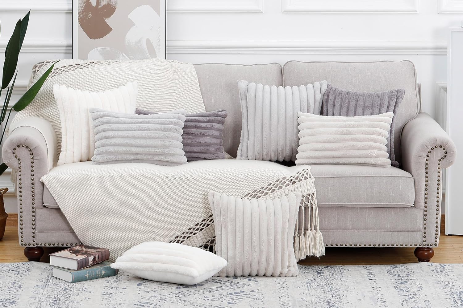 MADIZZ Set of 2 Faux Wool Plush Decorative Throw Pillow Covers 16x16 Inch Light Grey Fluffy Striped Soft Decorative Cushion Cover for Sofa Bedroom Pillow Shell