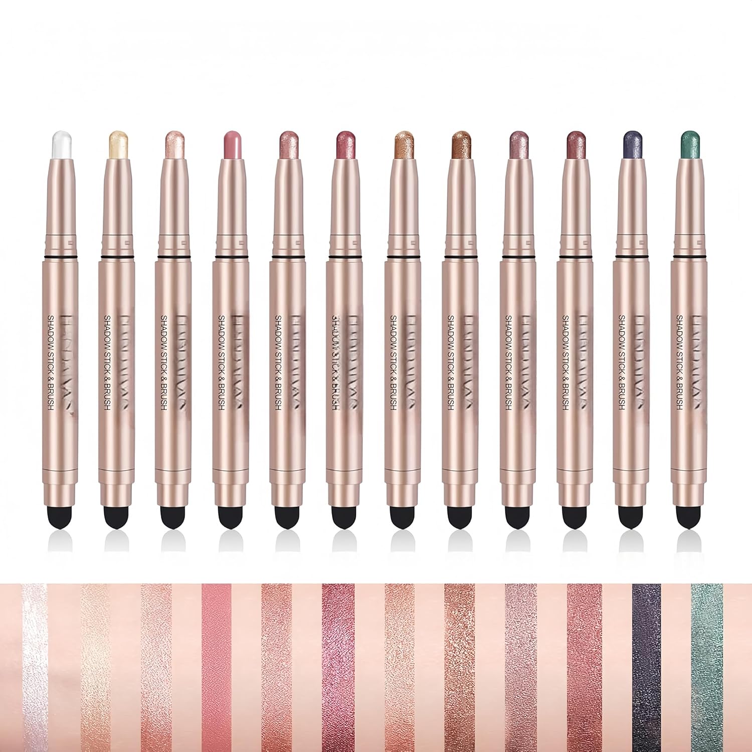 - đă12 Colors Eyeshadow SetăThis highly pigmented eyeshadow stick come with 12 colors, from warm to cool color, elegant pink to sexy brown eyeshadow, advanced gray to bright gold, can be used to give you daily and luminous makeup.