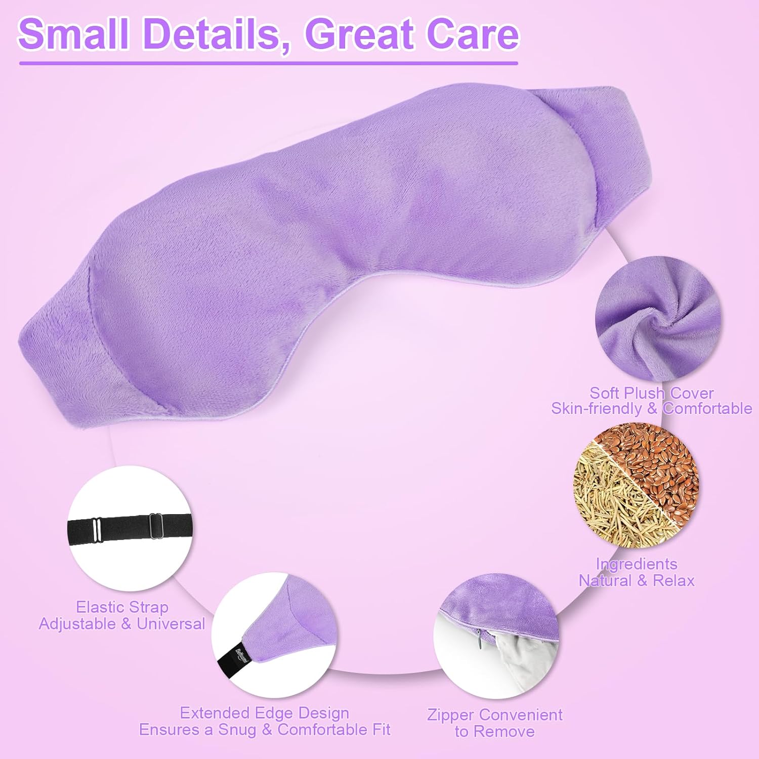 - [Comfortable and Convenient to Use] This eye mask is made by skin-friendly & soft plush cover. Extended edge designed to ensure a comfort snug fit. High-grade zipper for convenient to detach and wash. And the elastic strap is adjustable and universal for most of head size. To use the eye mask, just take out the plush eye cover, put the inner bag on a clean microwave, then heat it for 20s-30s, Install to the plush eye cover and wear it on your eyes.